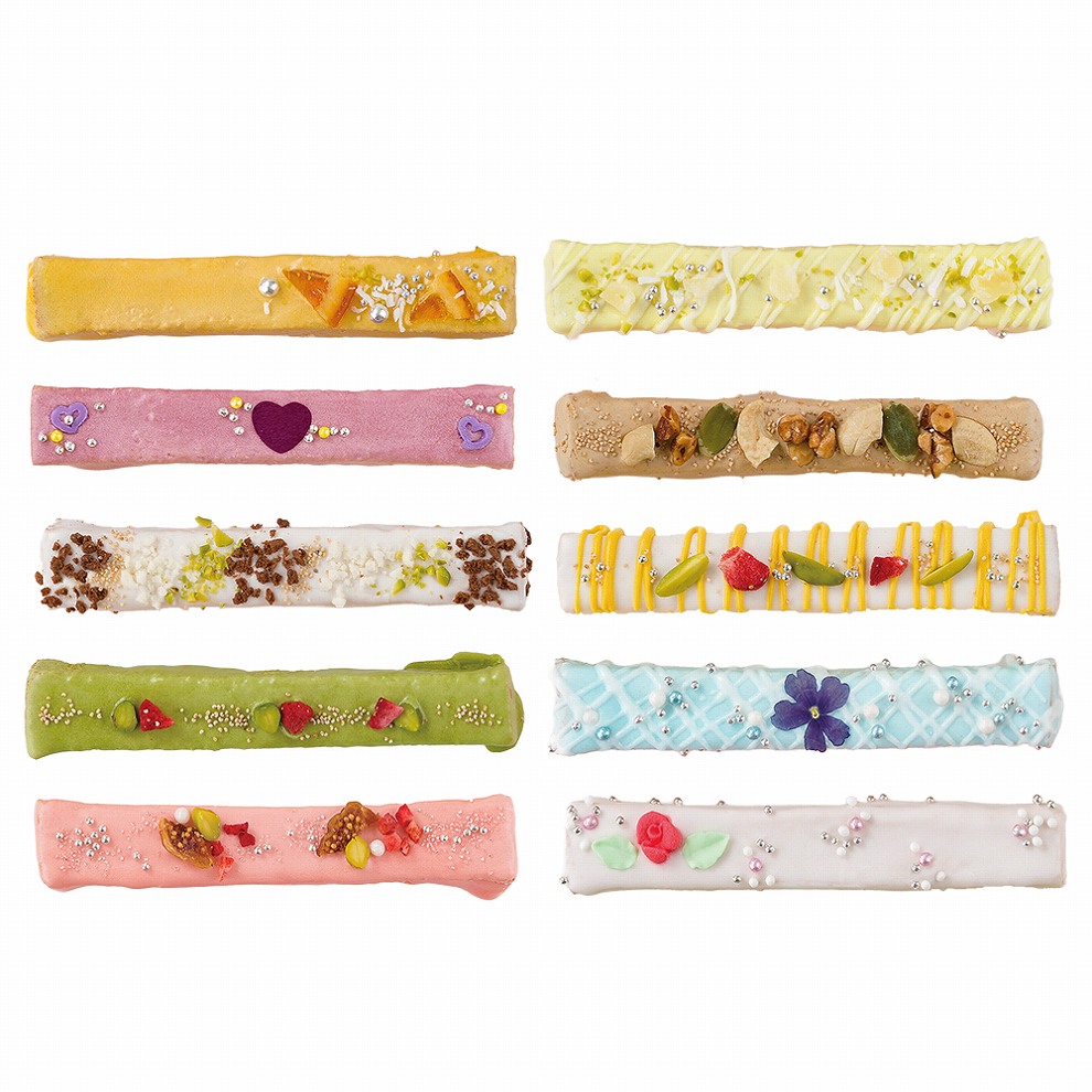 サクサクの食感に仕上げたスティックラスクに、フルーツ果汁をふんだんに使ったアイシングでコーティング!お花やドライフルーツ、ナッツなどでトッピングされた、まるで宝石のようなスイーツ 彩り豊かでフルーティーなフレーバーは今の季節しか味わえない期間限定商品です。