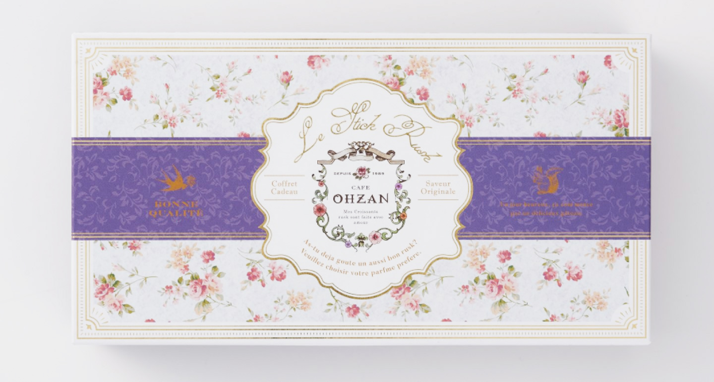 CAFE OHZANのブランドロゴと花をあしらった、華やかさと高級感のあるデザインです。 贈られた方が笑顔になる大人可愛いパッケージです。