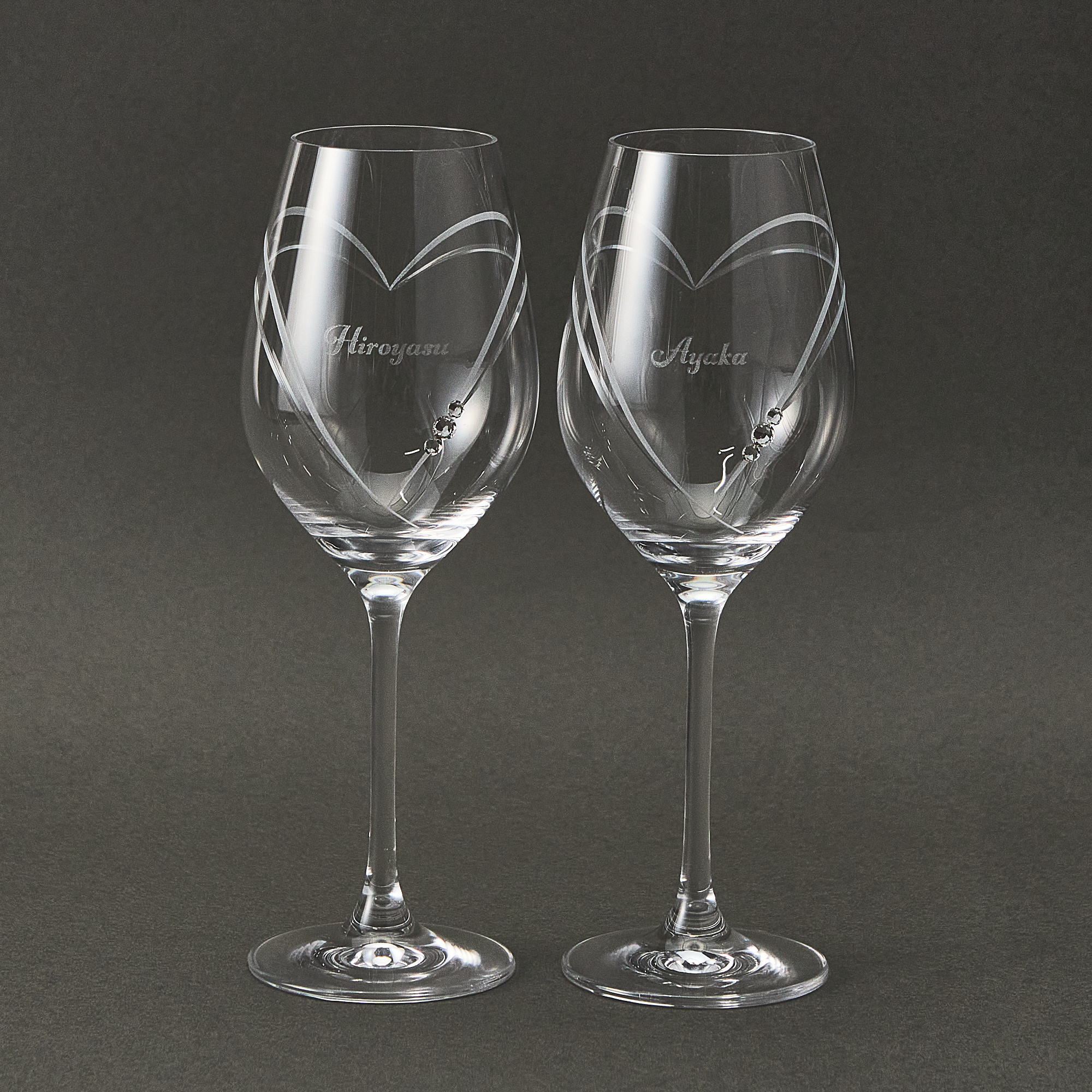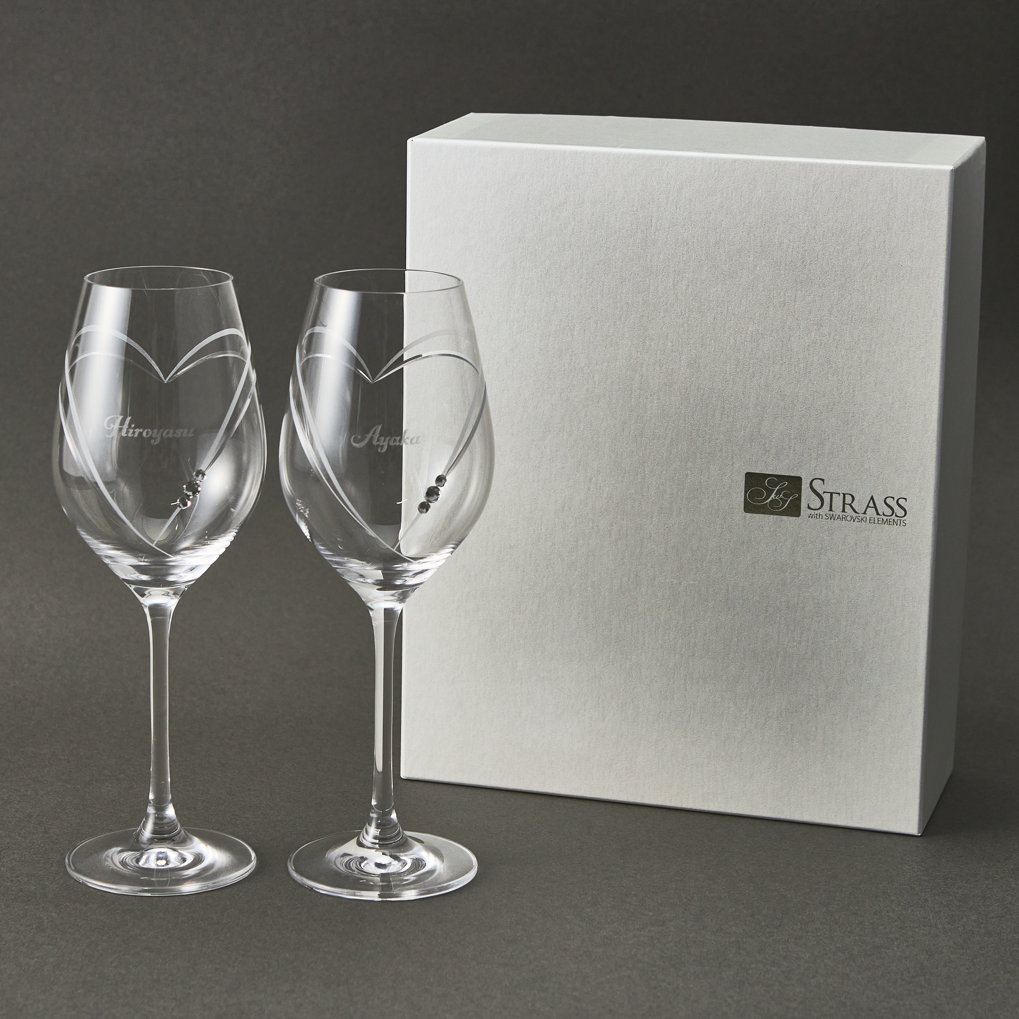 スロバキアのガラスメーカーのグラスに、クリスタルストーンの代名詞であるスワロフスキーを大胆に施した贅沢なワイングラス。結婚祝いや結婚記念日のプレゼントに人気のペアセットです。グラスにはお名前を彫刻することができ、一生思い出に残るペアアイテムです。ハート型のカットもとってもおしゃれで、清楚感あふれるホワイトカラーなのでお祝いにぴったりです。