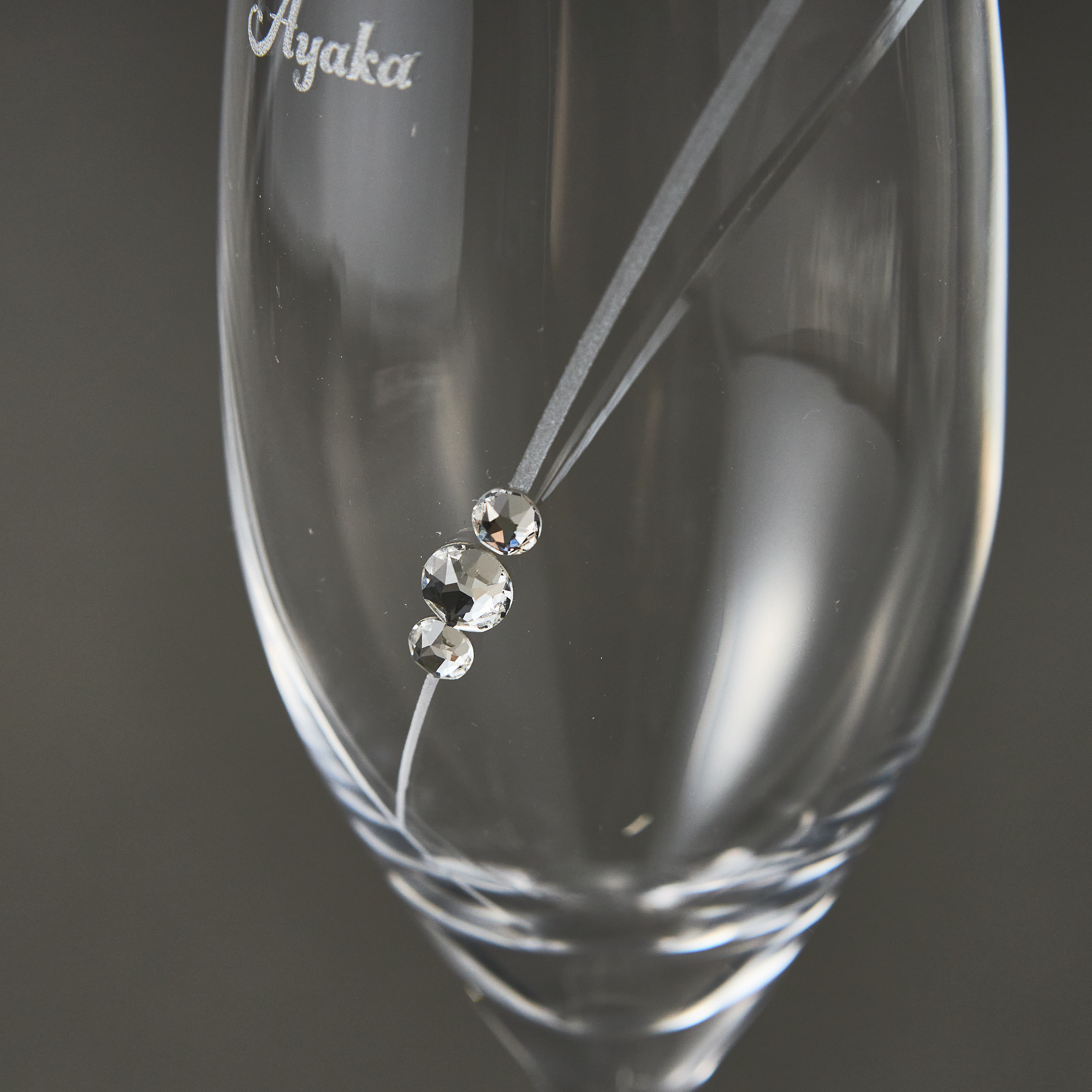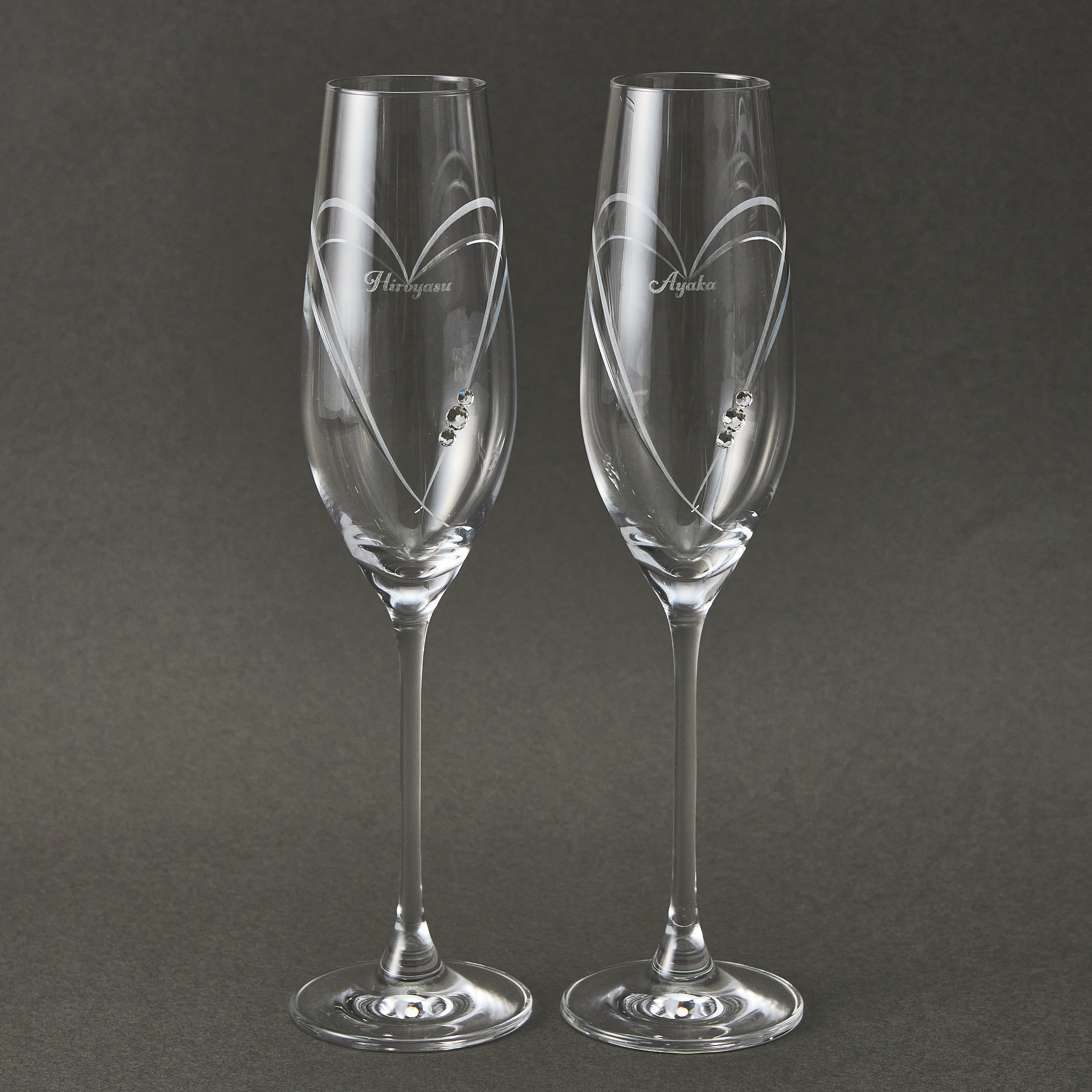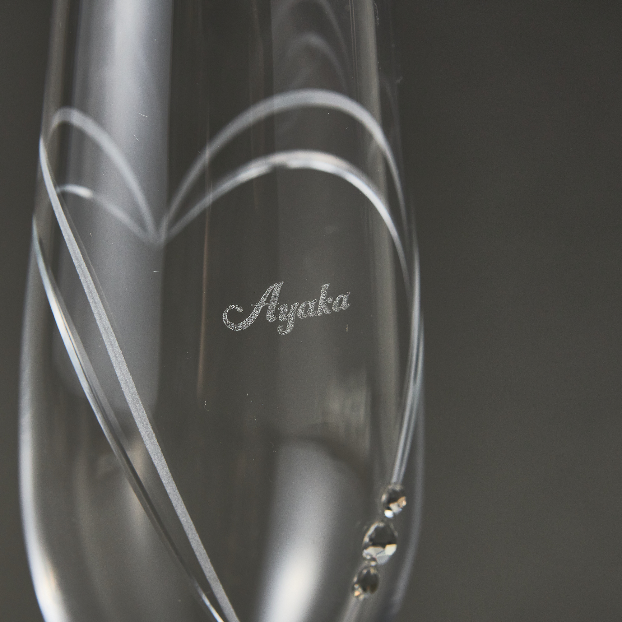 ハートのマークがうっすらと描かれた高級感あふれる魅力的なペアグラスです。滑らかな曲線で刻まれたラインの上に、スワロフスキーが美しく輝きます。またグラスにはお名前を彫刻することができ、一生思い出に残るペアアイテムです。