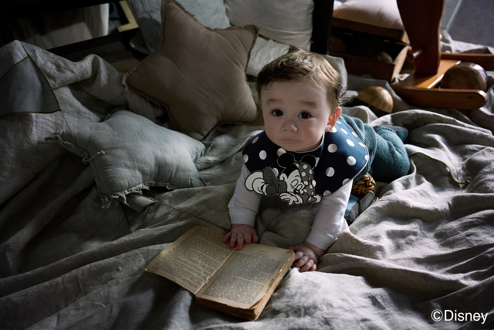 大口注文・法人のお問い合わせはこちらすやすやと気持ちよさそうに眠るミッキーが夢の世界からポップアウト。 シルバーの箔プリントが夜空に浮かぶ月のように煌めき、ミッキーの夢の中に誘い込まれるようなドリーミーなスタイです。ミッキーの形をしたシルバードットが後ろ姿のさりげないワンポイントに。 夜の静けさを思わせる落ち着いた色合いとデザインは、ニットパンツやロンパースと合わせてリラックス感あるコーディネートにマッチします。