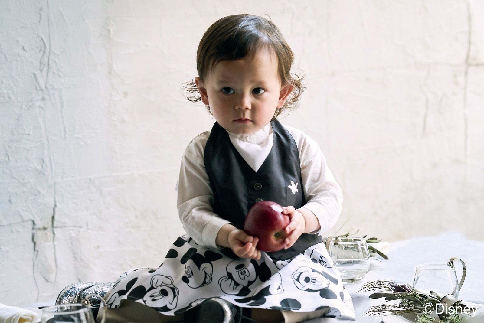 楽しいお食事タイムはミッキーと一緒。人気のお食事エプロンがミッキーデザインになって登場です。表情豊かなミッキーのさまざまなお顔を、モノトーンでシックな柄にしました。コサージュの代わりにあしらった胸元のミッキーハンドが小洒落たワンポイントに。