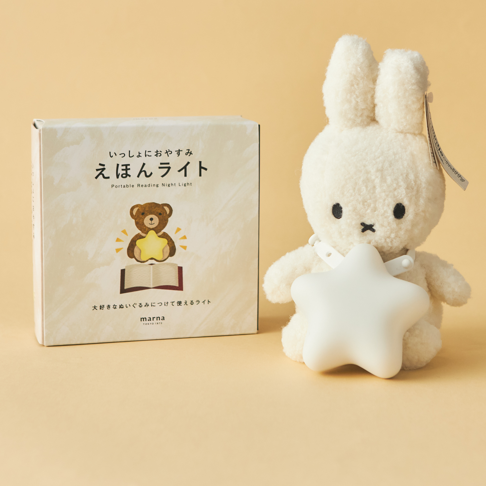 環境にやさしい再生素材を使用し、手作りのクオリティで愛されるぬいぐるみとお気に入りのぬいぐるみに取り付けられ、あたたかい光で絵本を照らすことができるえほんライトのセットです。タンプ限定ギフトボックスに入れてお届けします。