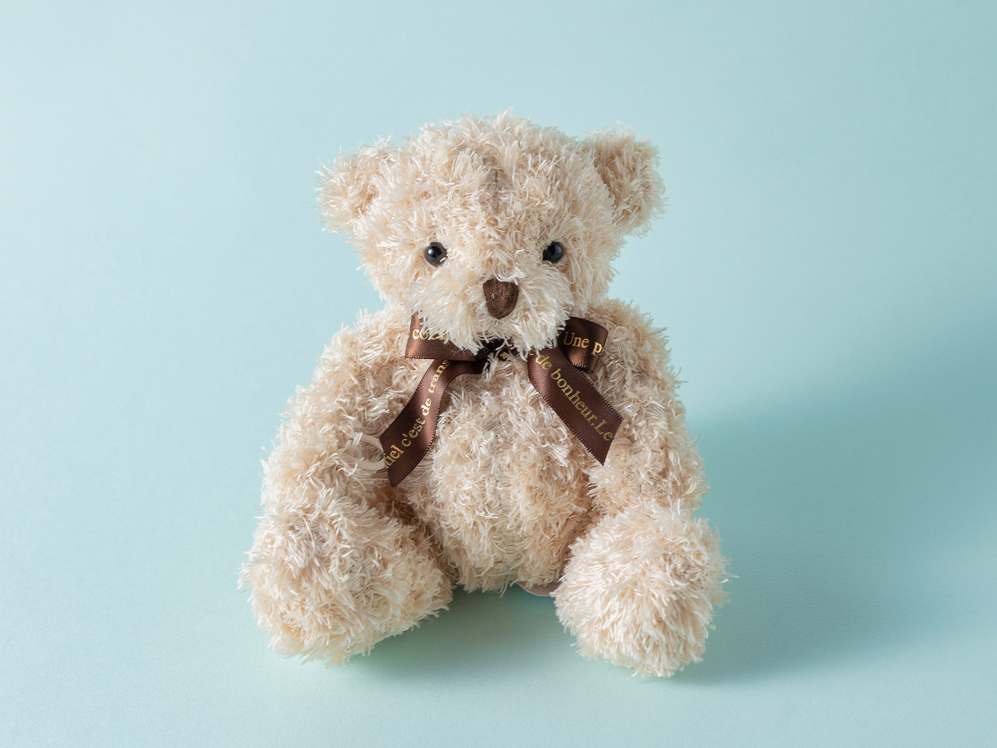 首元にリボンを巻いた可愛らしいテディベアです。