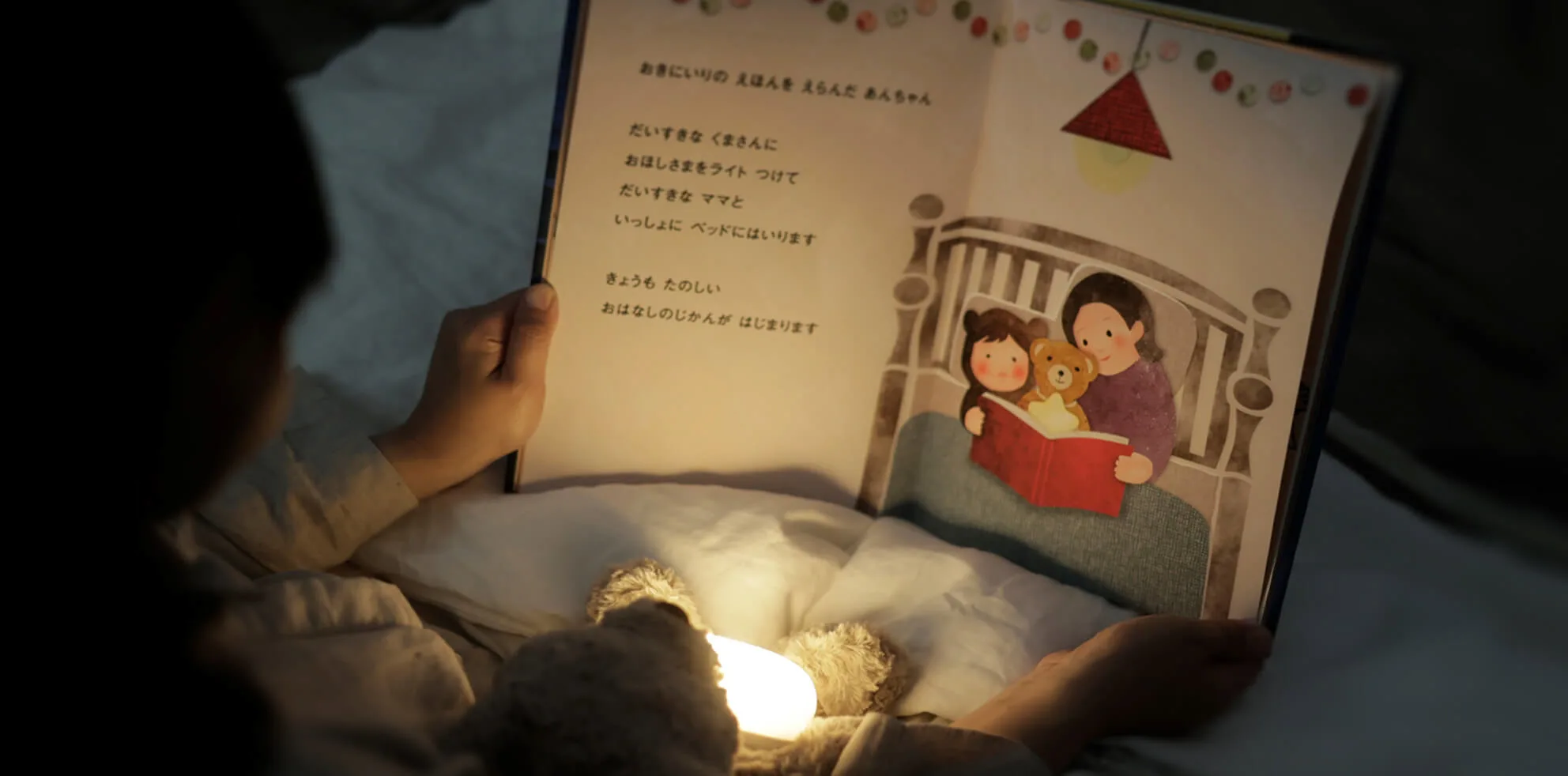 電球色のあたたかい光で絵本を照らし、おやすみ前の心地よい時間を演出します。 30ルクス以下※の暖色系の明かりで眠りを妨げません。 ※ライトから30cm(垂直方向)の距離で計測した場合