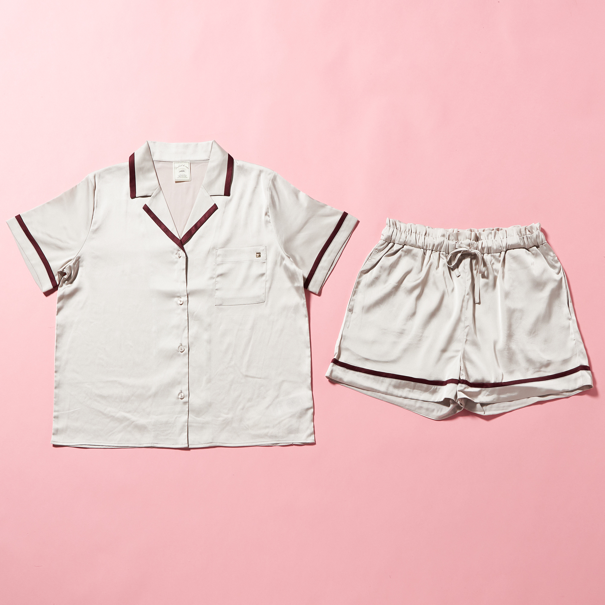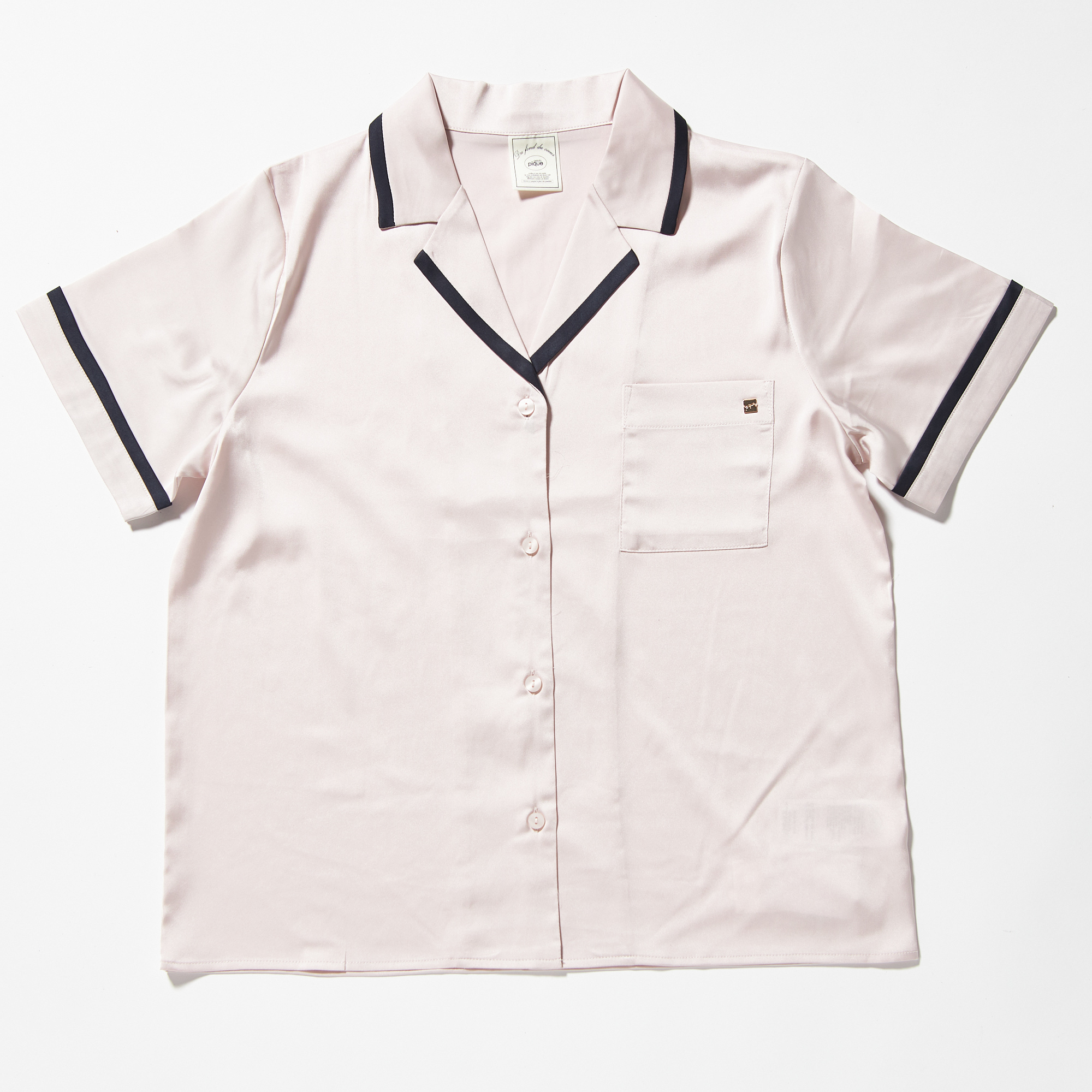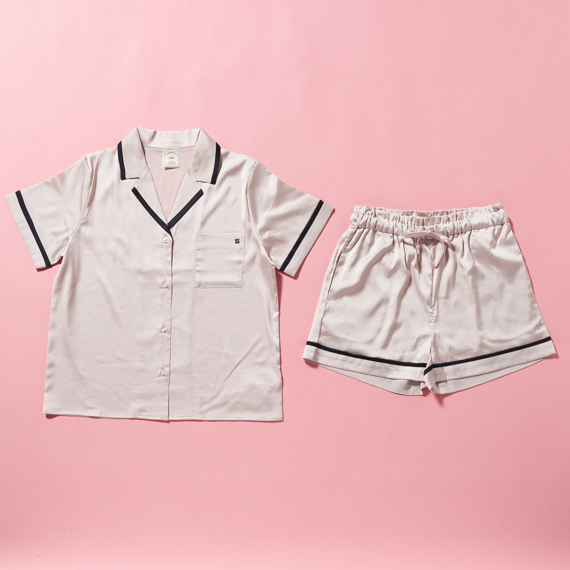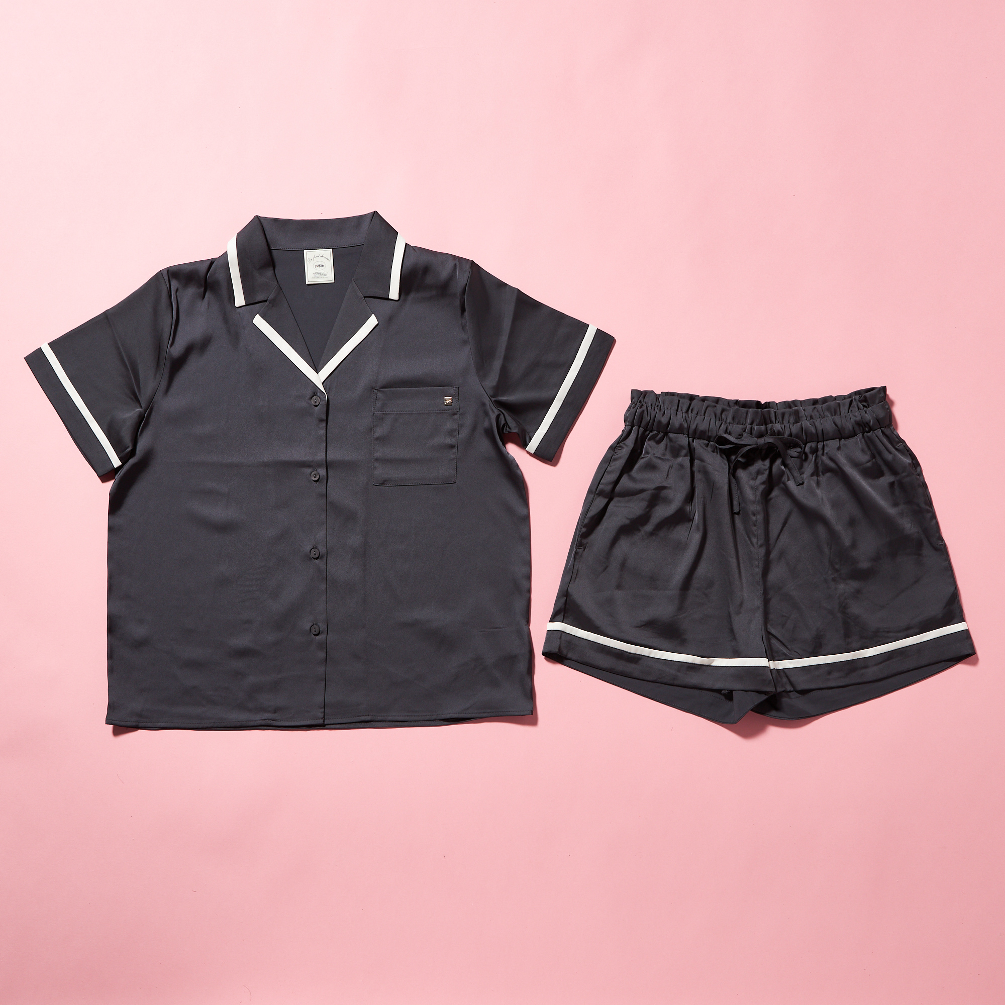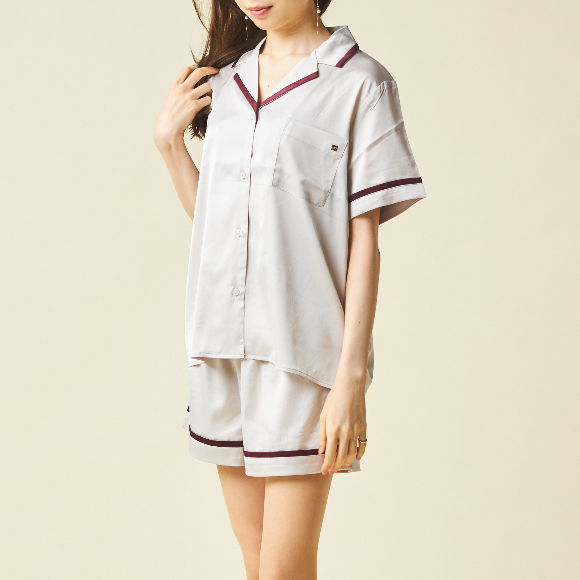 ラインデザインがスタイリッシュな開襟のサテンシャツとショートパンツのセット。上品な光沢感のあるサテン生地を使用しました。