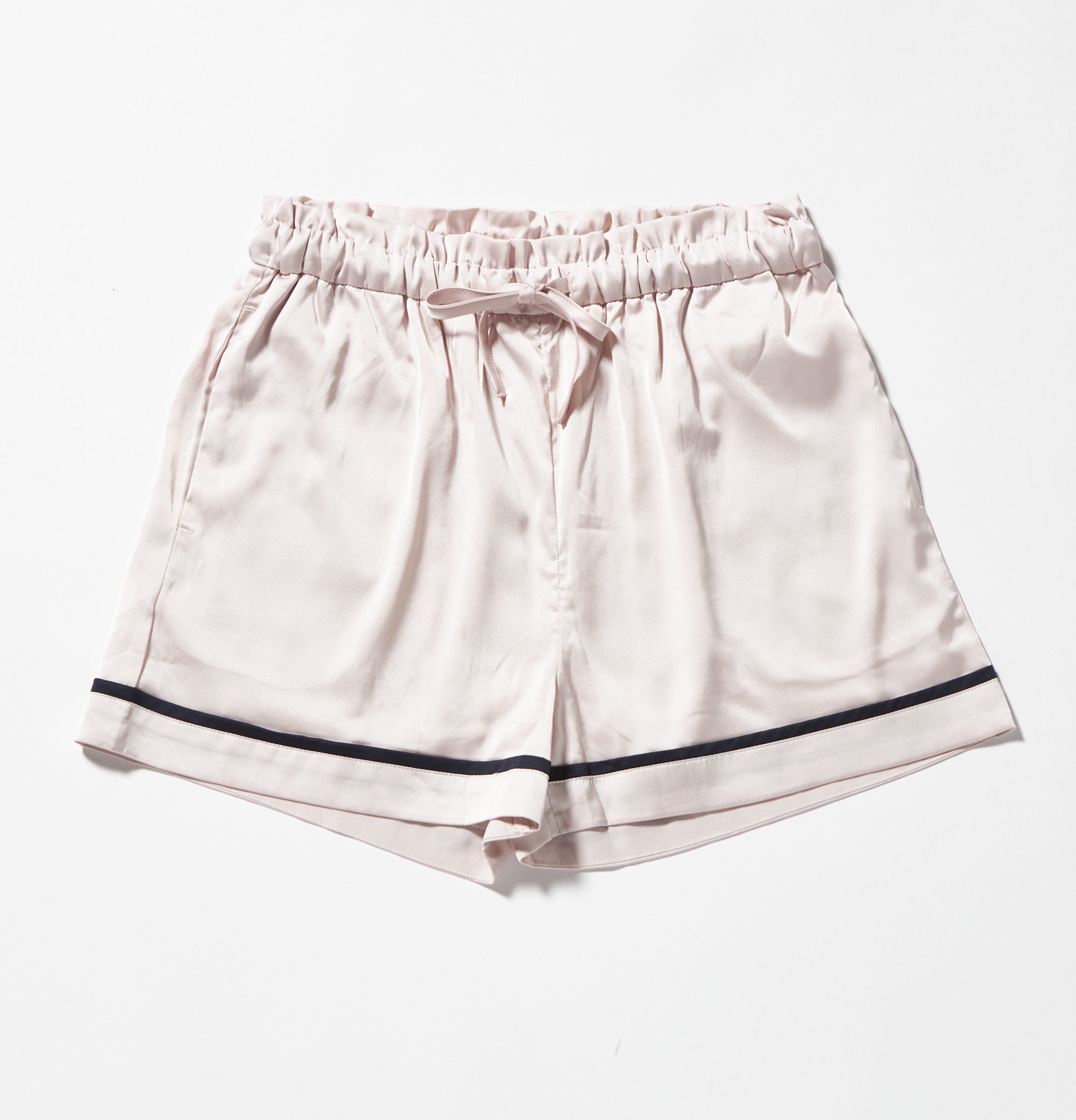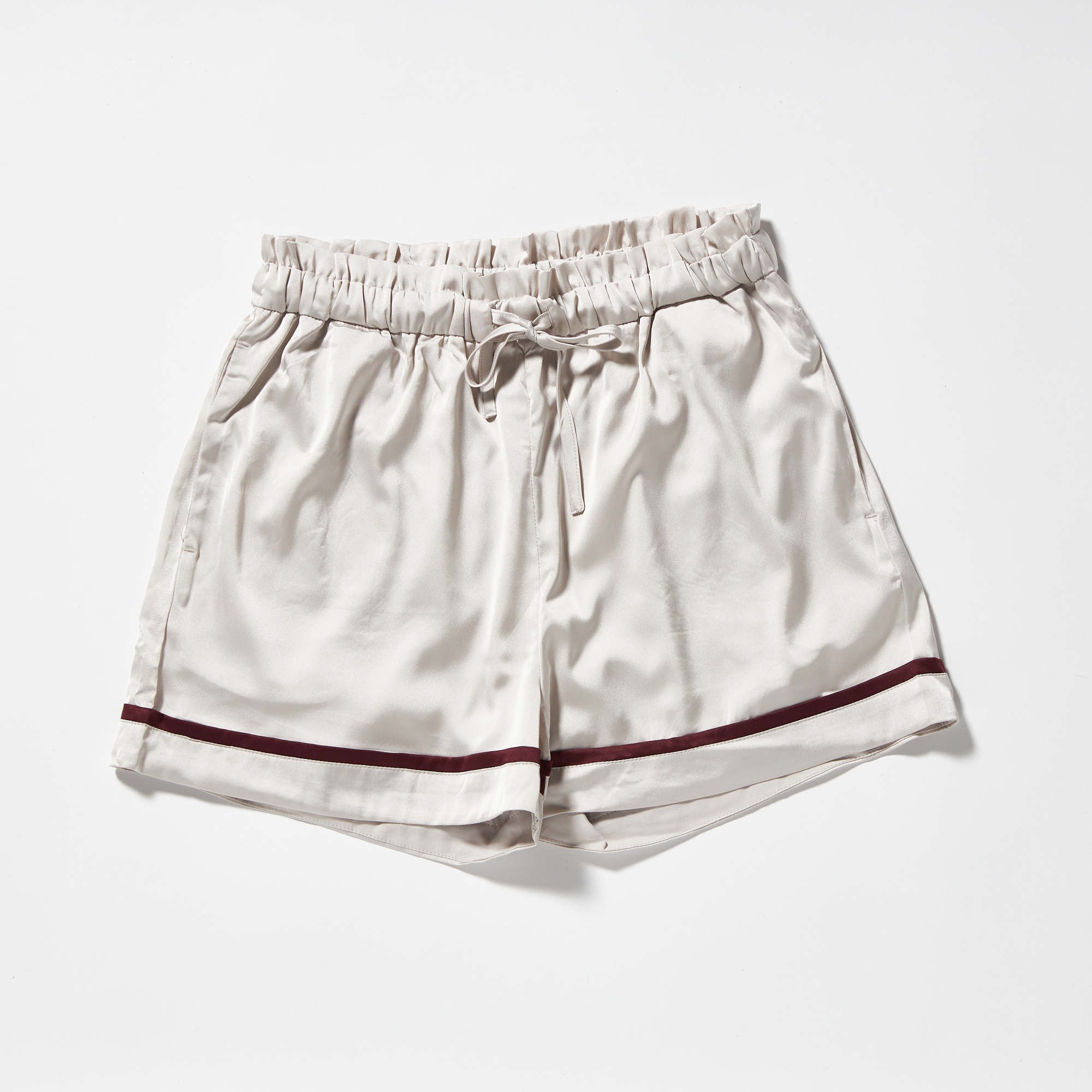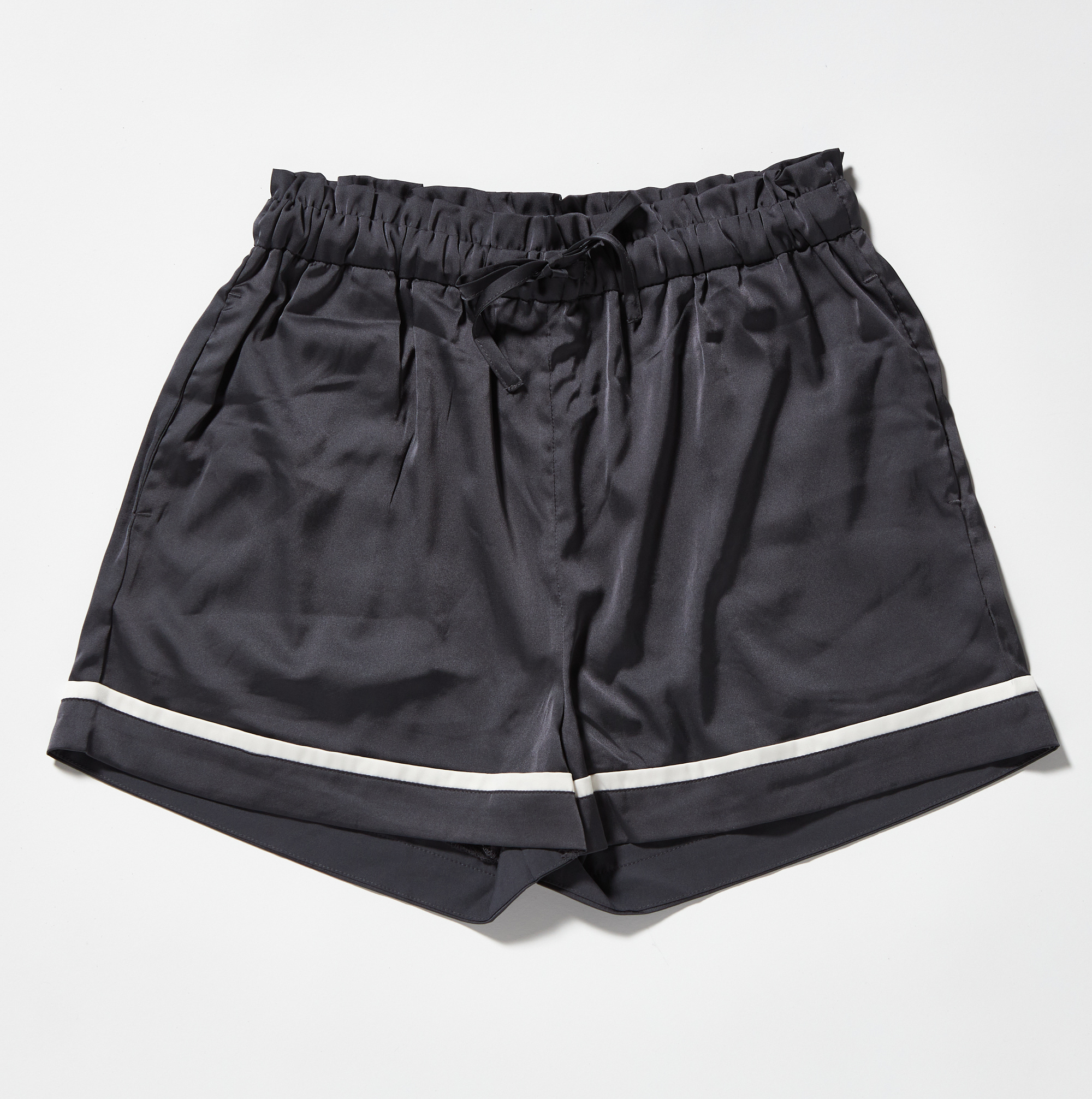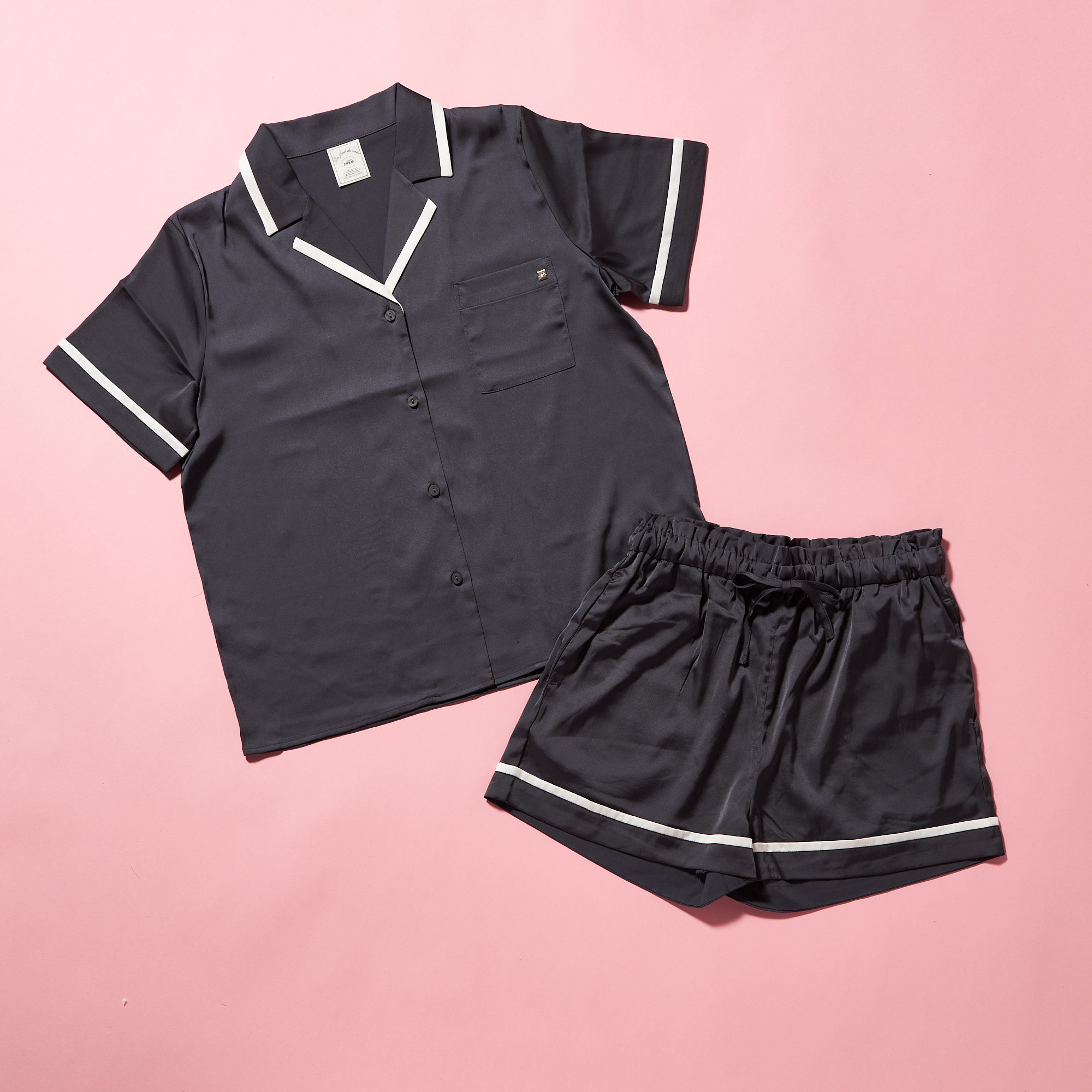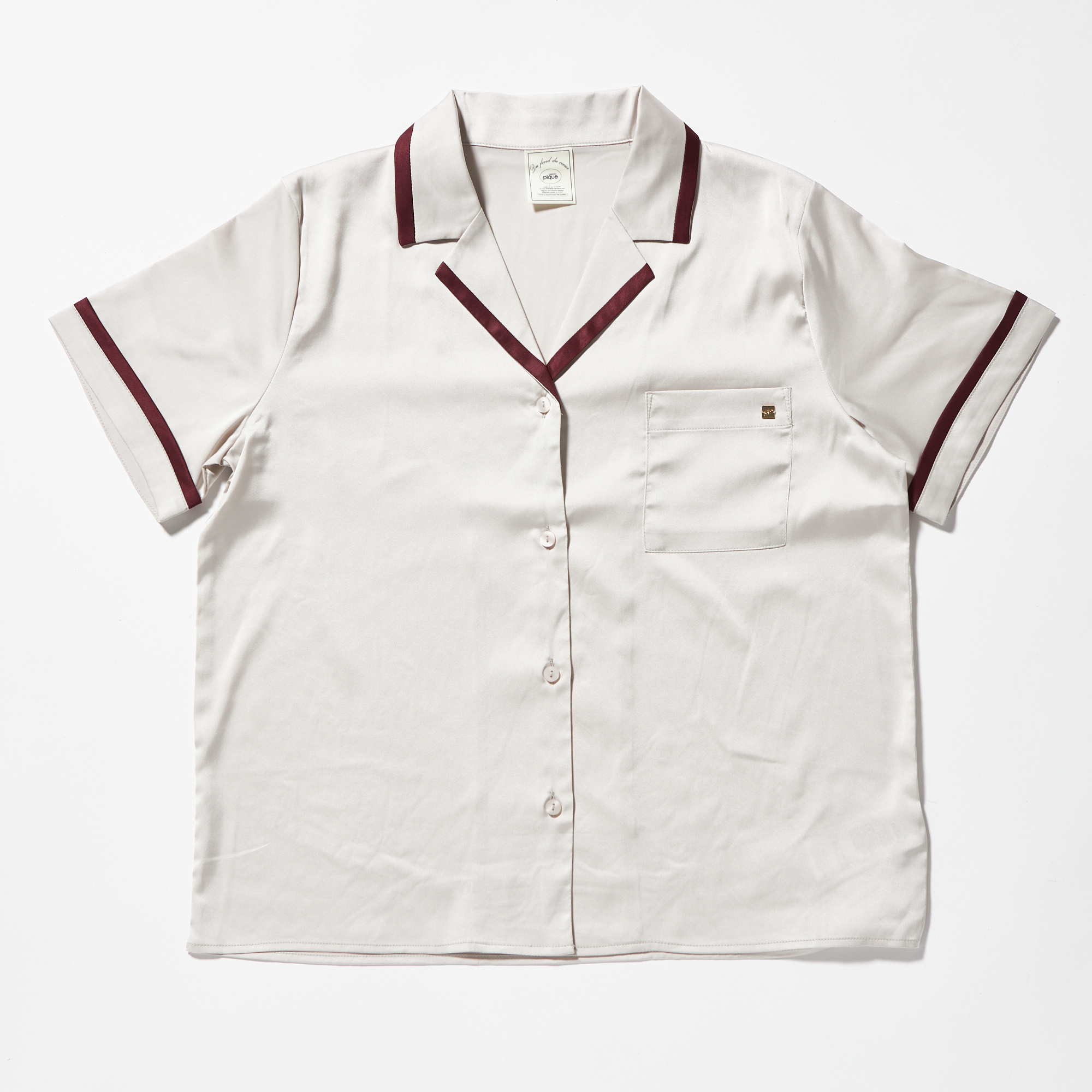 ラインデザインがスタイリッシュな開襟のサテンシャツとショートパンツのセット。上品な光沢感のあるサテン生地を使用しました。
