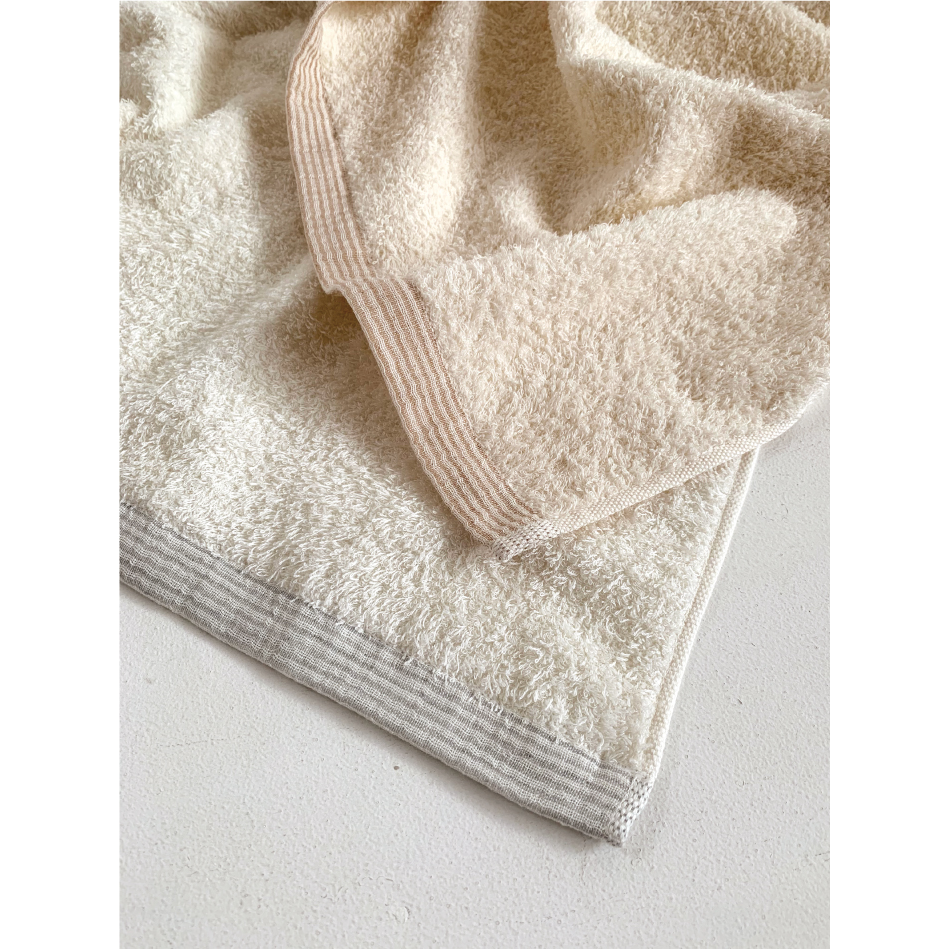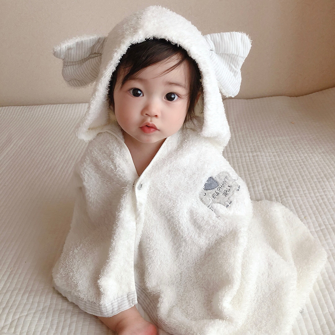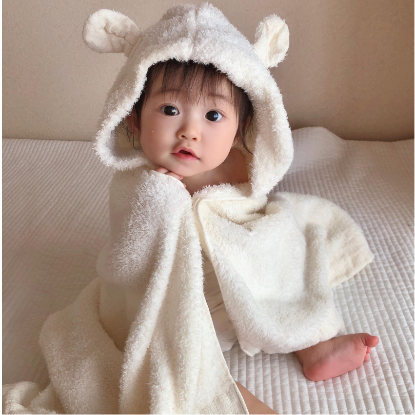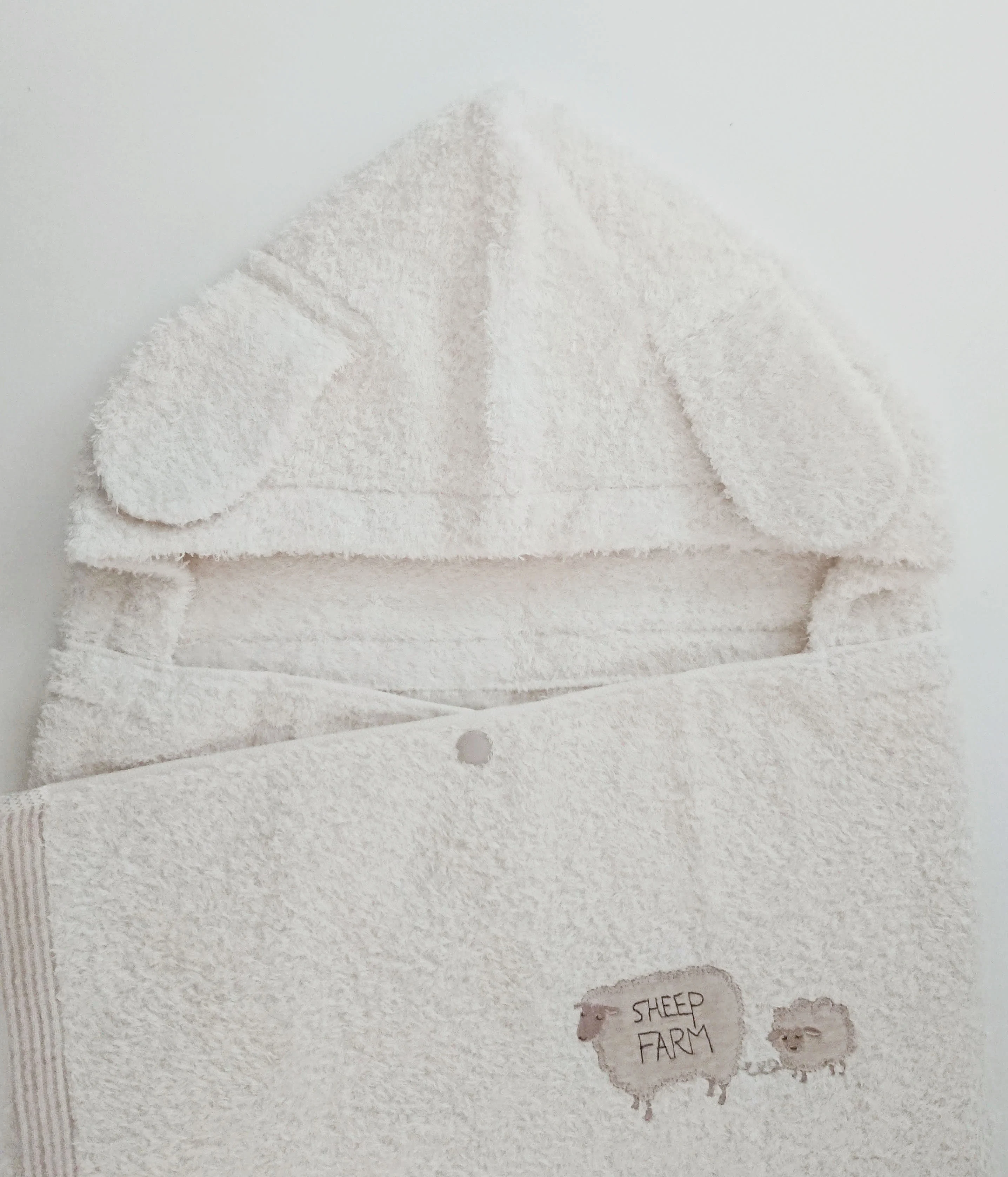 最後に紹介するのは「アイボリー」のセットです。 フードからぴょこんとたつうさぎの耳とアイボリーの相性はバッチリです。 アイボリーのバスタオルを着たら、赤ちゃんはもはや「仔ウサギ」です!
