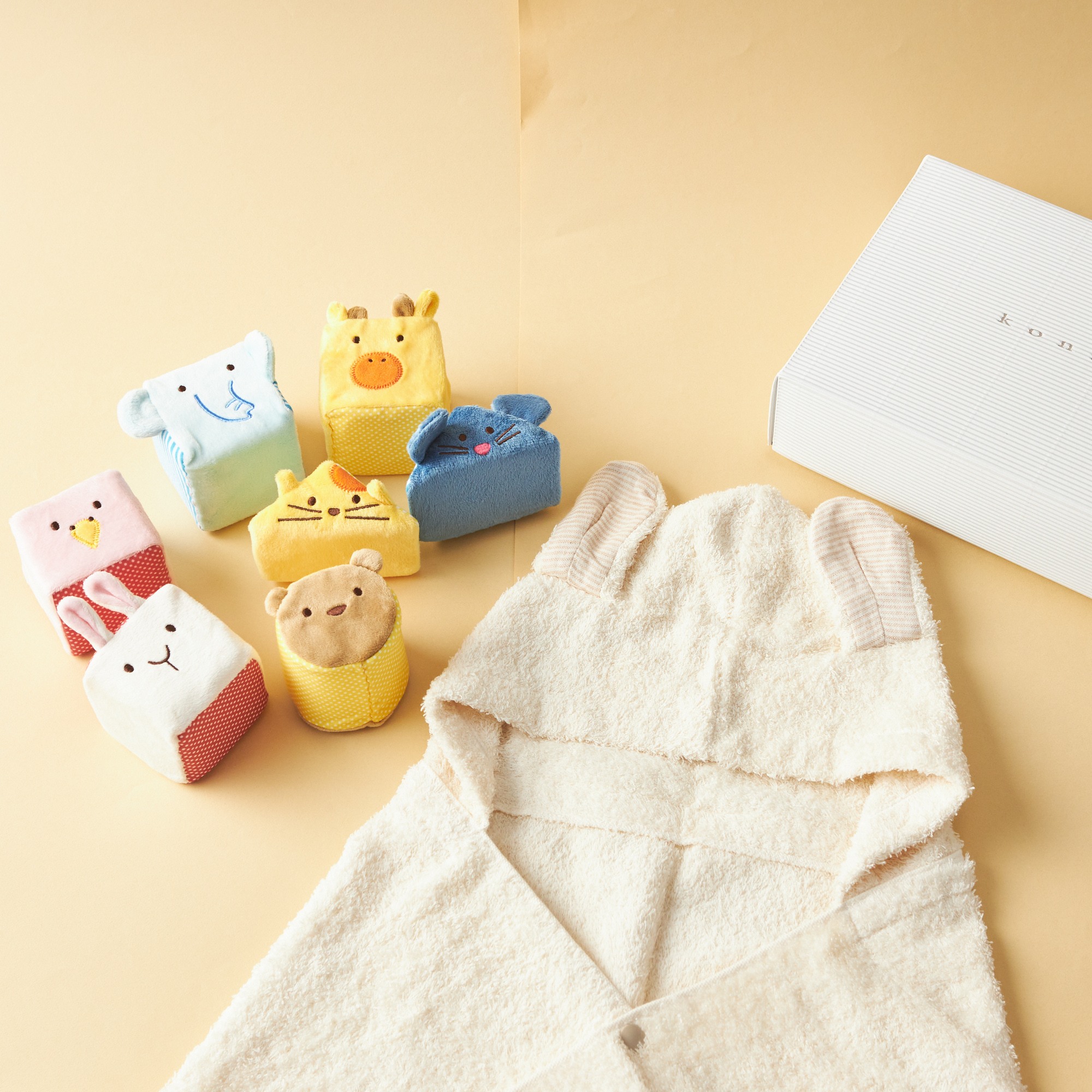 ふわふわアニマルブロックと動物のデザインが可愛いフード付きバスタオルのセットです。様々な感覚を養うことができるおもちゃとある程度大きくなってからもお使いいただけるバスタオルをお届けします。
