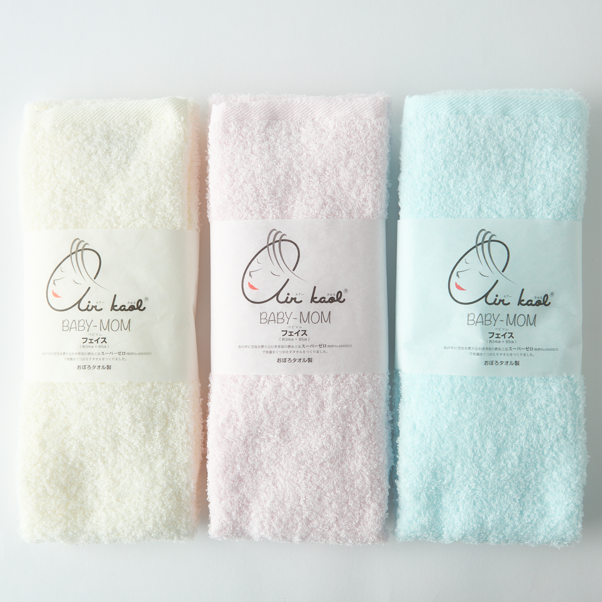 大口注文・法人のお問い合わせはこちら細糸でふんわり仕上げた、エアーかおるシリーズ最軽量の「エアーかおるBABY-MOM(ベビマム)」。 赤ちゃんや敏感肌にも安心して使え、繊細な肌触りにこだわっています。 そのやわらかさも、エアーかおるでNo.1。 かるくて、やわらかくて、まるで空気みたい。 ママのだっこみたいにやさしいタオルです。