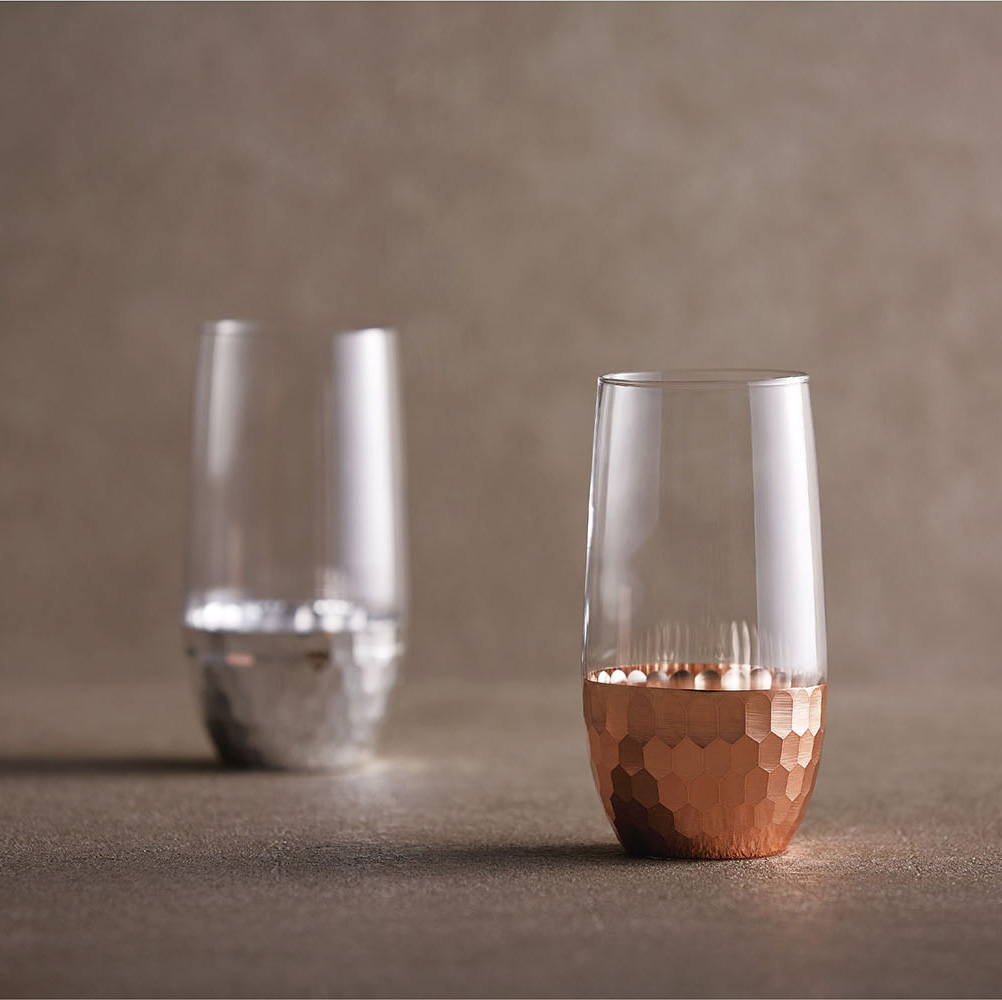 槌目風の独特なテクスチャーが楽しめるbrillantシリーズ。 上部をガラスにすることで槌目のデザインがより際だちます。 また飲み物の冷たさが直接伝わるので、清涼感をお楽しみいただけます。