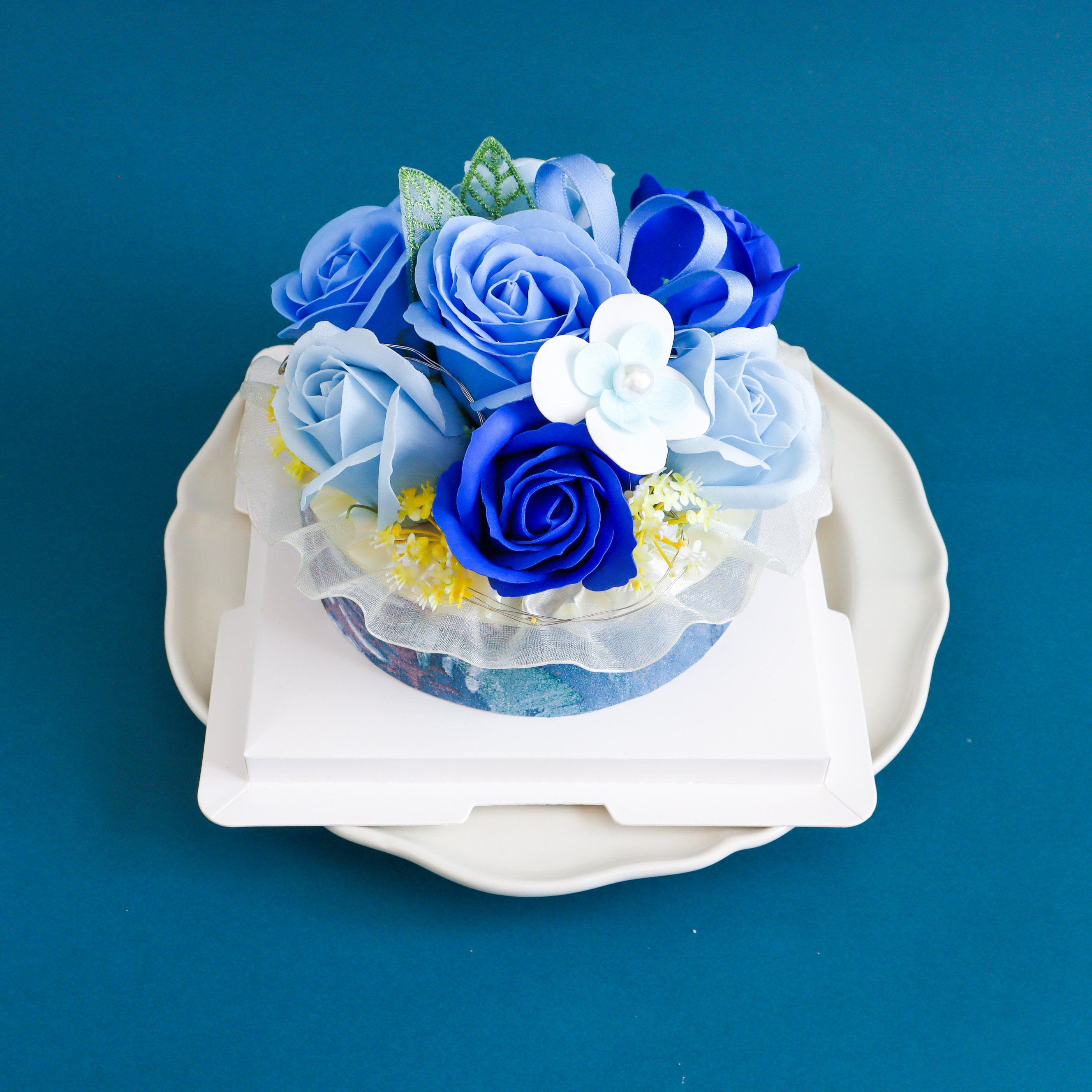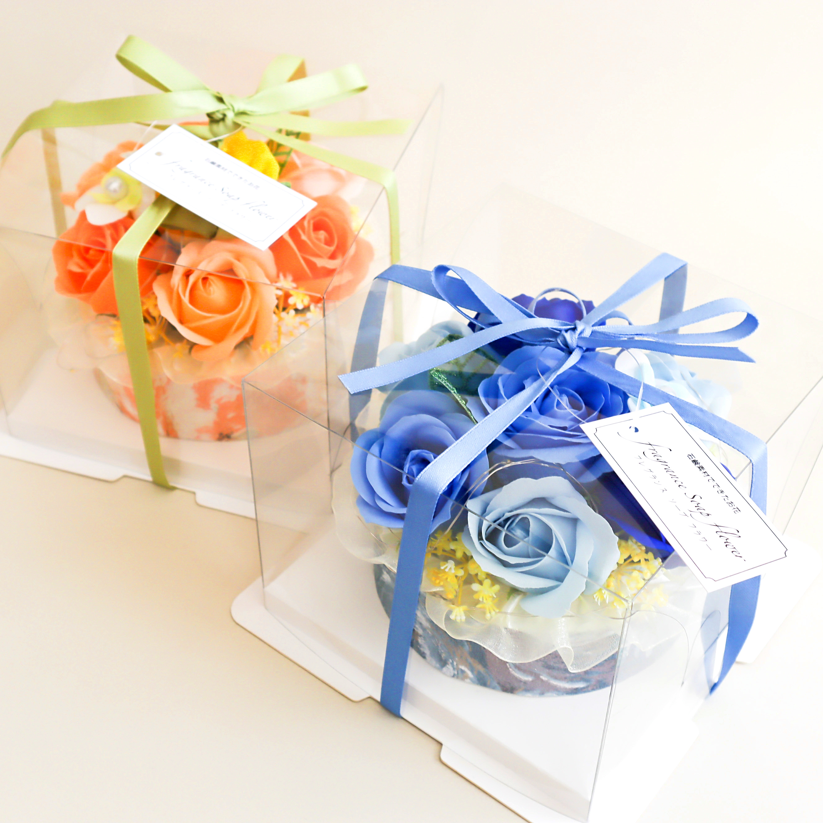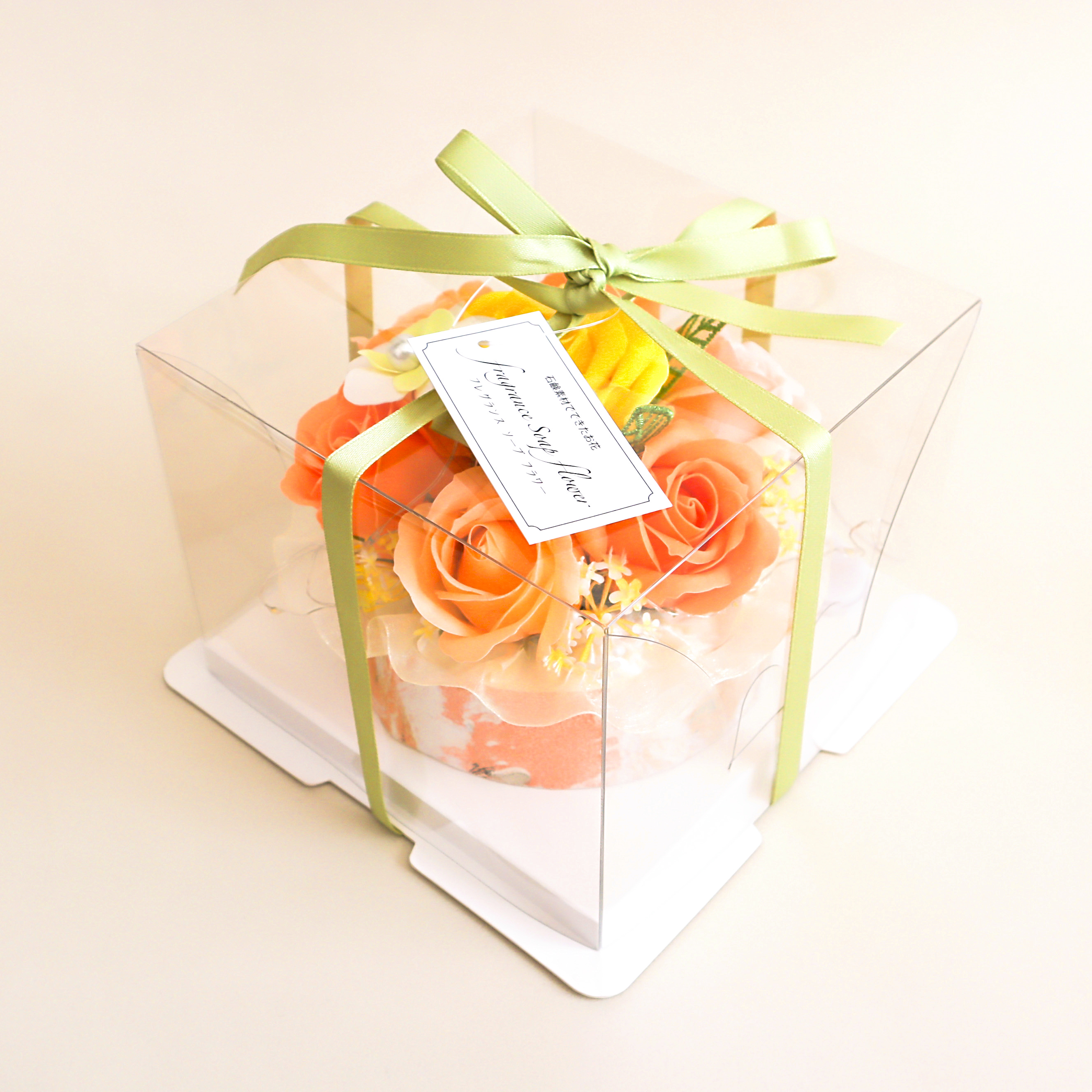 「karendo(カレンド)」がお届けする、ソープフラワーのギフト「LEDフラワーケーキ」です。ろうそくの代わりにLED(電池式)を光らせてお祝いすることができます。ケースを開けたときのふんわりと香る石けんの香りも魅力的です。