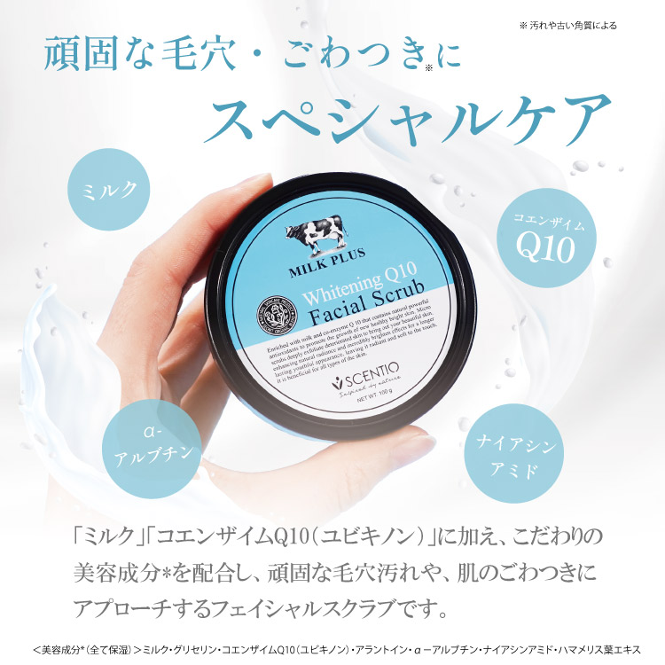 大口注文・法人のお問い合わせはこちら「ミルク」「コエンザイムQ10(ユビキノン)」に加え、こだわりの美容成分*を配合し、頑固な毛穴汚れや、肌のごわつきにアプローチするフェイシャルスクラブです。 汚れをスポンジのように吸着させる、弾力のある肌あたりのやさしいスクラブ(合成ワックス)を配合。スクラブ(合成ワックス)によるマッサージ効果で毛穴の奥(角層まで)からしっかり汚れを取り除き、乾燥や皮脂でごわついたお肌を、なめらかなミルク肌へ整えます。 「ミルクホワイトブライトニング・フェイシャルフォーム」でのデイリーケアに加え、週2回~のスペシャルケアとして併用することで、スクラブが毛穴の汚れをかき出し、より頑固な毛穴汚れにアプローチ。毛穴の目立たない、つるんと透明感あふれる肌へ導きます。
