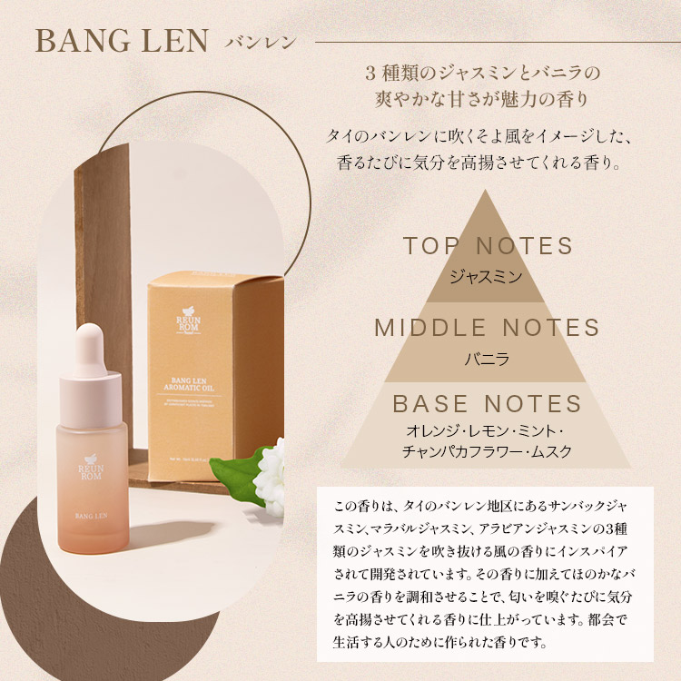 大口注文・法人のお問い合わせはこちらタイのランドマークをイメージした香りのアロマオイル。バンレン・パタヤ・ラチャブリ、3つの地方に旅に訪れたような気分を楽しめる香りです。 旅先を訪れたような気分になれる、プレゼントにもぴったりの香りです。