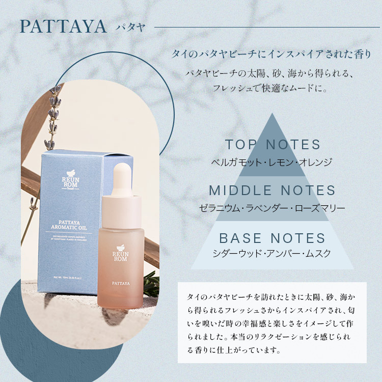 パタヤビーチのフレッシュな太陽・砂・海からインスパイアされた香りです。 楽しいバカンス気分や幸福感をイメージした香りで、リラクゼーションのひとときを。 トップノート:ベルガモット・レモン・オレンジ ミドルノート:ゼラニウム・ラベンダー・ローズマリー ベースノート:シダーウッド・アンバー・ムスク