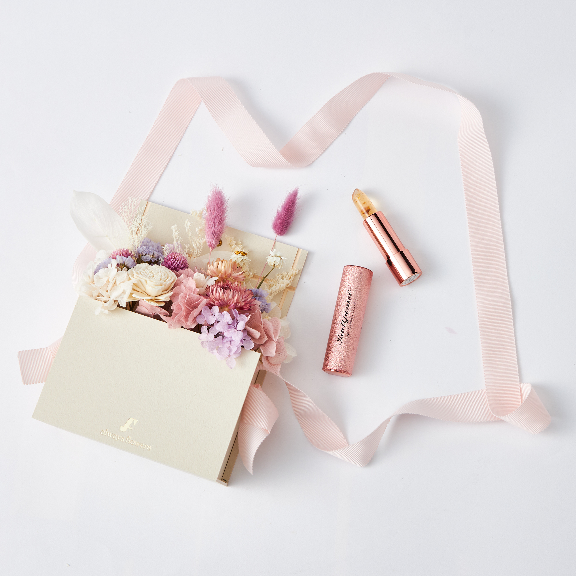 タンプ限定デザインのプリザーブドフラワーと、色落ちしないティントリップのセットです。プリザーブドフラワーは長さ調整の出来るリボンが付いているので、肩へかけての持ち運びも可能。リップは色落ちしにくく、自分だけの色に染まります。一本で様々な表情を見せてくれる魅惑のリップ。