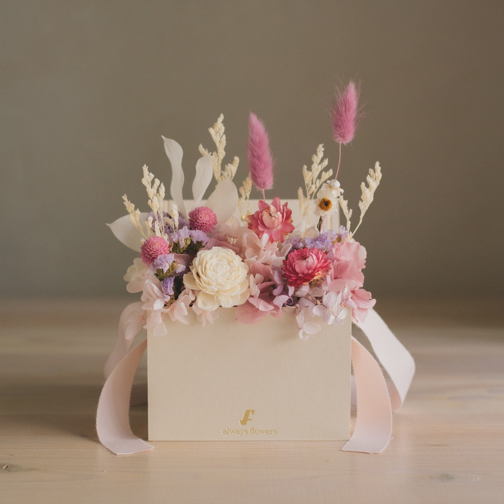 バッグのように持ち歩ける遊びゴコロたっぷりのフラワーアイテム。 お花はドライフラワーとプリザーブドフラワーでお作りしているので長くお楽しみいただけます。 お家では、置いたり、壁掛けにして飾ったり様々な楽しみ方が出来る優秀アイテム。 バッグ形のアレンジメントボックスは、ワイドに広がりがあるからスペースを取らずに、それでいて華やかに飾れます。 デザイナーチョイスの季節のドライフラワーがバッグから溢れるデザインに心がときめきます。