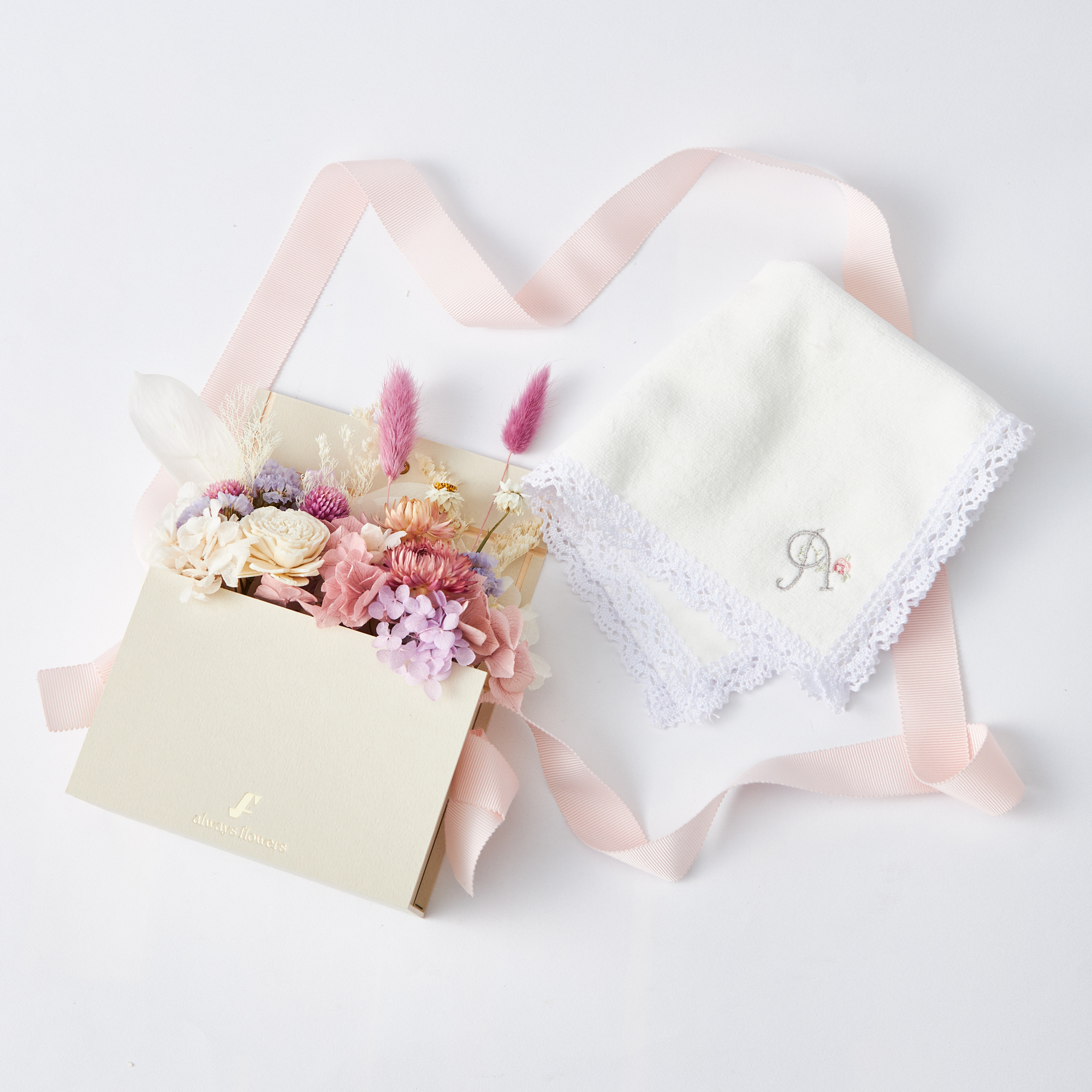 タンプ限定デザインのプリザーブドフラワーと、イニシャル入りハンカチのセットです。プリザーブドフラワーは長さ調整の出来るリボンが付いているので、肩へかけての持ち運びも可能。ハンカチは肌触りがソフトで、お肌にやさしいタオル生地でできています。