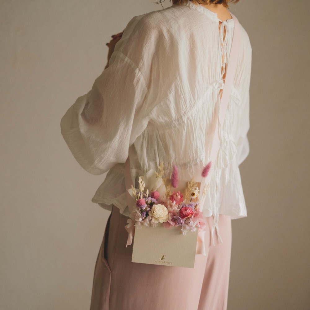 バッグのように持ち歩ける遊びゴコロたっぷりのフラワーアイテム。 お花はドライフラワーとプリザーブドフラワーでお作りしているので長くお楽しみいただけます。 お家では、置いたり、壁掛けにして飾ったり様々な楽しみ方が出来る優秀アイテム。 バッグ形のアレンジメントボックスは、ワイドに広がりがあるからスペースを取らずに、それでいて華やかに飾れます。 デザイナーチョイスの季節のドライフラワーがバッグから溢れるデザインに心がときめきます。