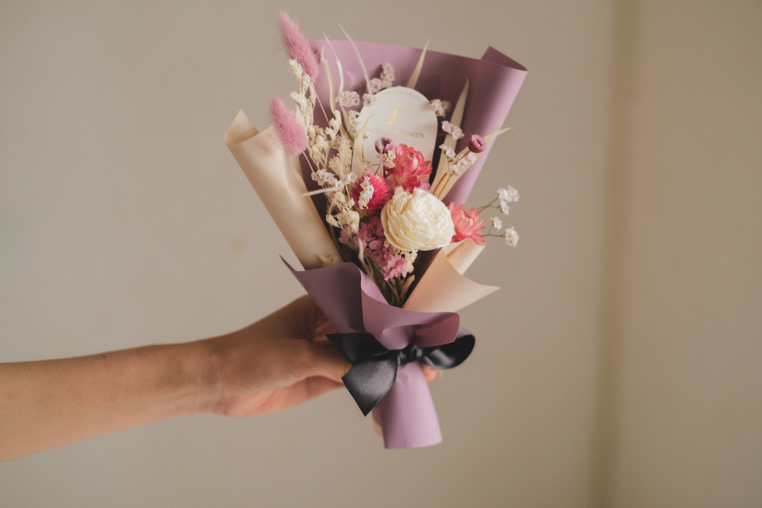 飾りやすいサイズのドライフラワーブーケです。 ちょっとしたインテリアにぴったり。卓上に置いたり、フラワーベースに挿して飾ったり様々な楽しみ方が出来る優秀アイテム。 お花はドライフラワーとプリザーブドフラワーでお作りしているので長くお楽しみいただけます。 デザイナーチョイスの季節のドライフラワーとラッピングの相性抜群。