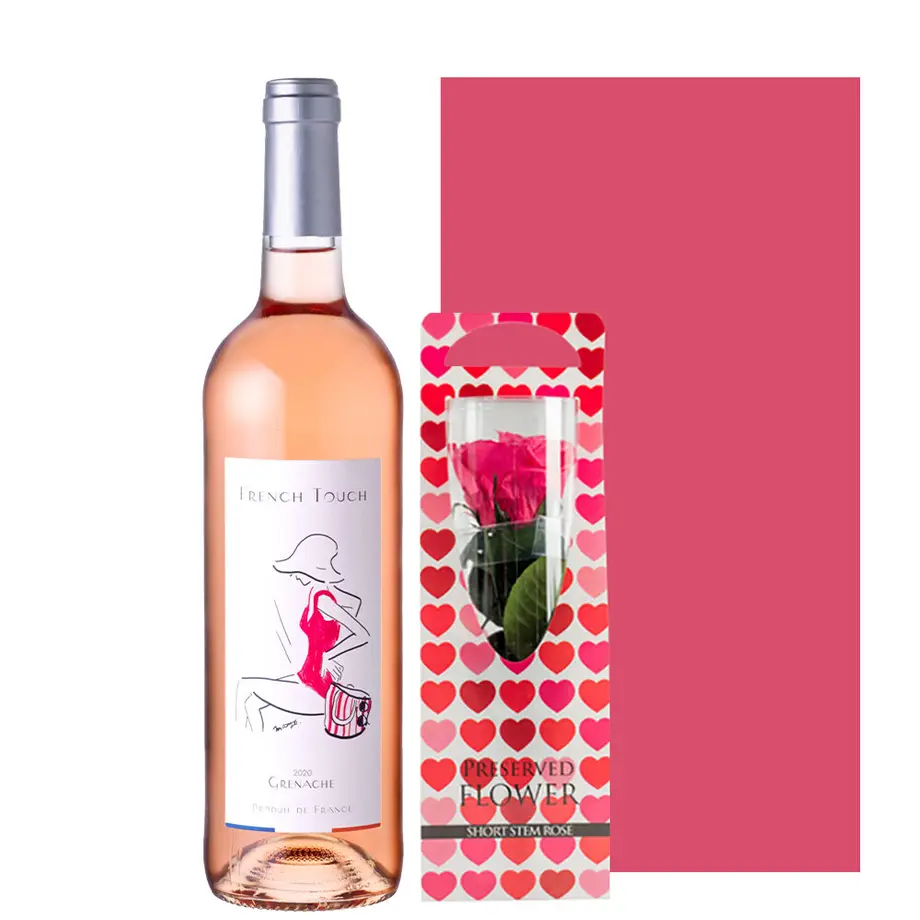 大口注文・法人のお問い合わせはこちら明るいピンク色のバラと南フランスのロゼワインを組み合わせた華やかなギフトです。