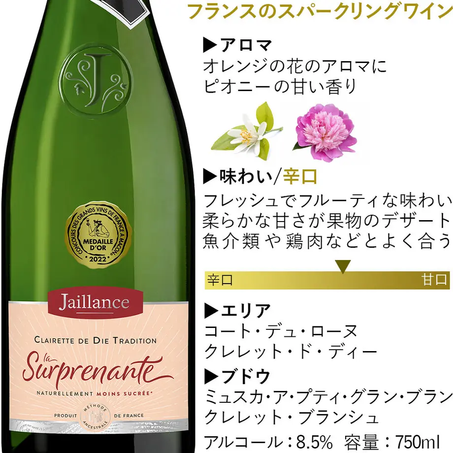 「クレレット・ド・ディー」は、南フランス、ローヌ地方、ディー村で造られる、伝統的な製法のスパーリングワイン。 淡いイエローの色調に、繊細な泡が立ち上がります。 オレンジの花のアロマに、牡丹の甘い香り。ナチュラルでほのかな甘みが感じられます。 フレッシュでフルーティな口当たりに、オレンジを思わせる柔らかな甘さと、綺麗な余韻がお楽しみいただけます。 アペリティフをはじめ、シーフードや鶏肉、フルーツを使ったデザートなど、幅広いお料理と合わせてお楽しみいただけます。 ※マコン ワインコンクール 2022 金賞
