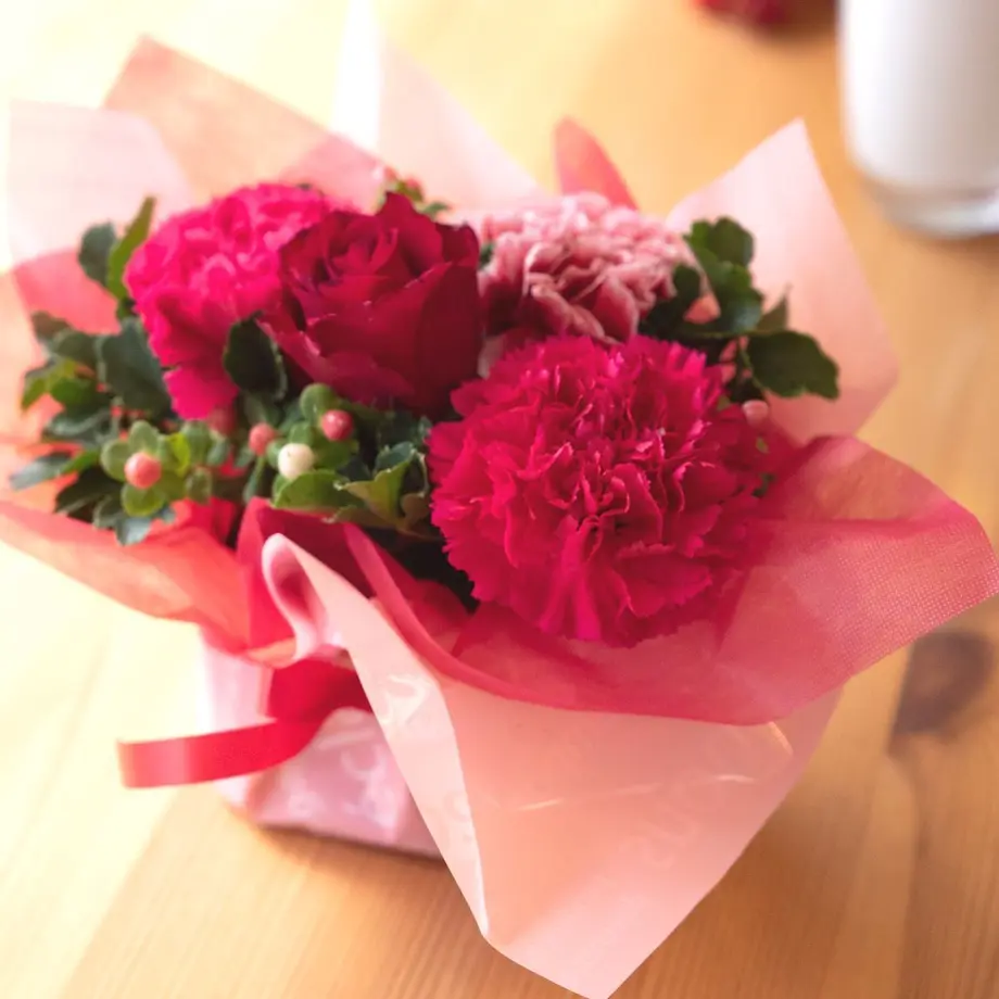 大口注文・法人のお問い合わせはこちらカーネーションがメインの鮮やかなお花アレンジ付きのバスケットギフト。大切なご家族やご友人へのギフトにおすすめです! こちらのセットは、バスケットの中にお花のアレンジメントとワインをセットし、クリアフィルムで全体を包んだ後、お花専用の箱にセットしてお送りいたします。
