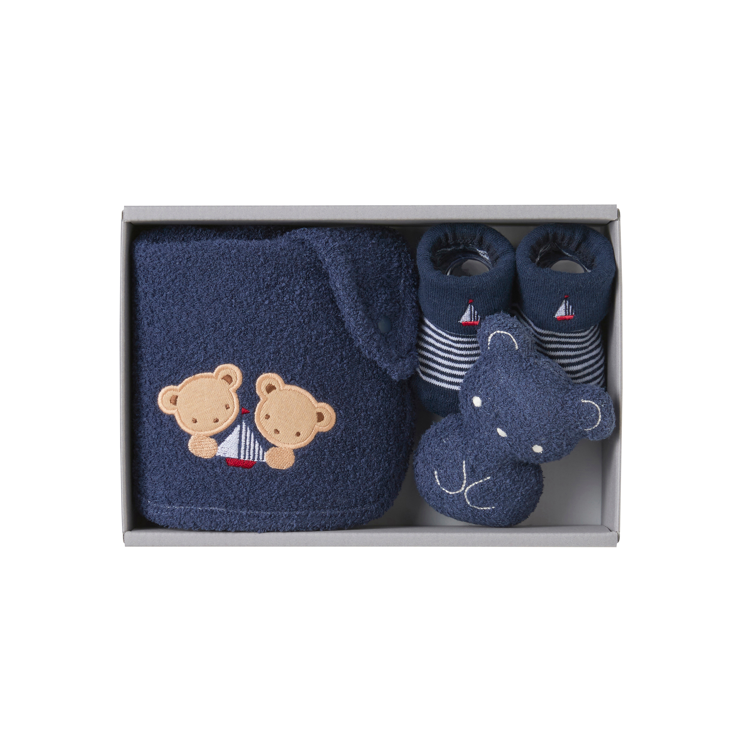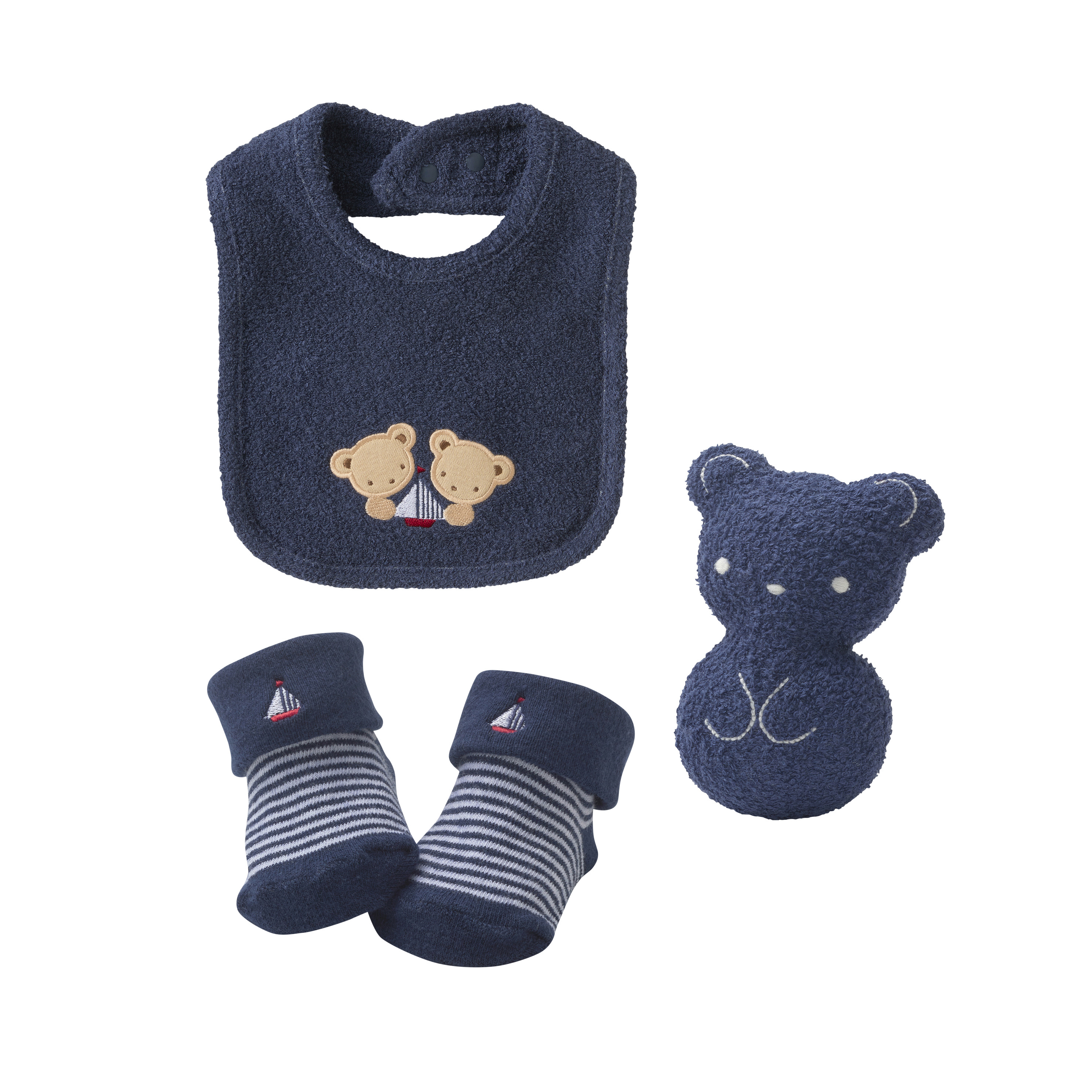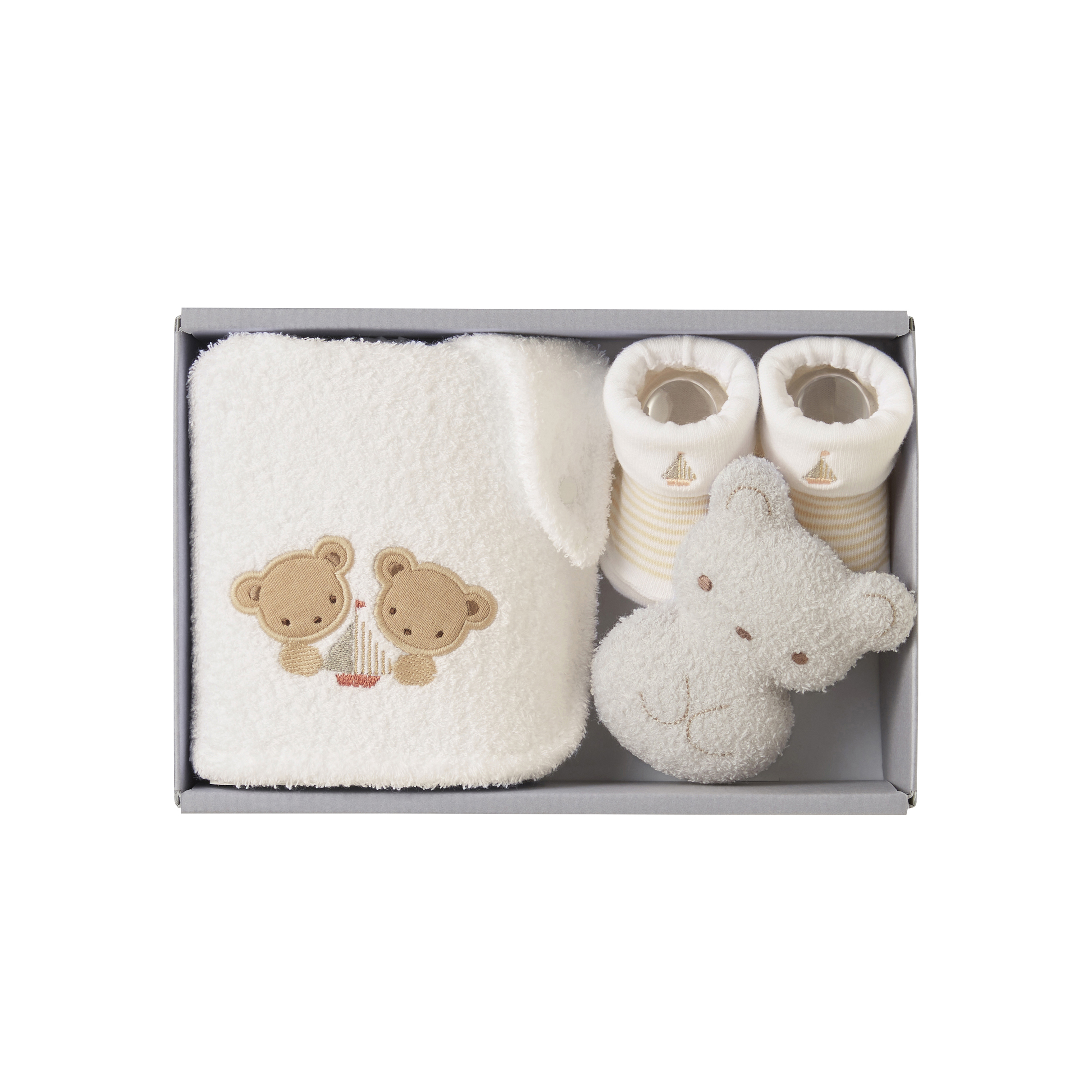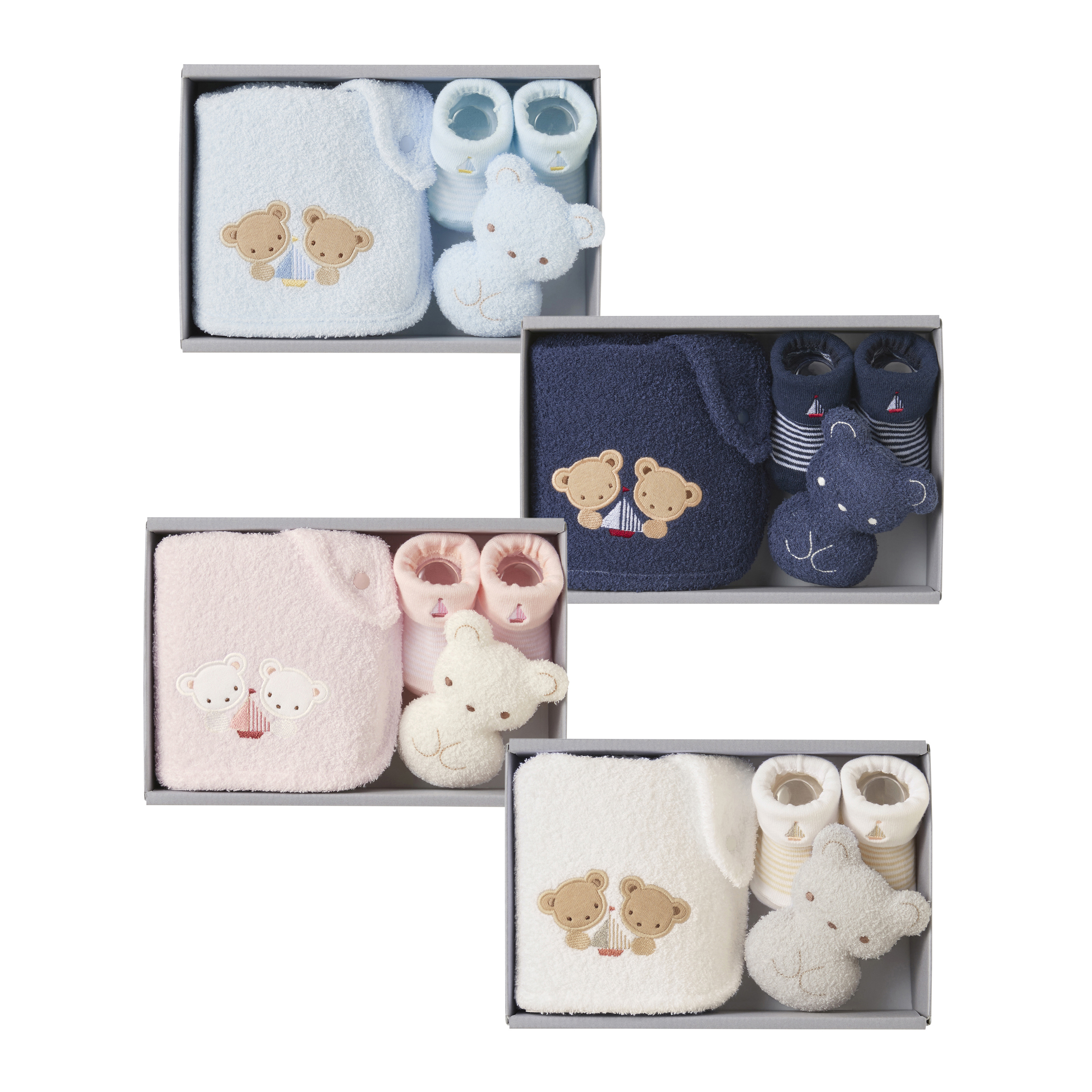 スリーピーパイルのスタイとマスコット、カップソックスの3点ギフトセットです。スタイとカップソックスは、ヨットのアートがリンクしているギフトセット限定デザイン。くまのマスコットはおなか部分を押すと音がなる仕様になっています。