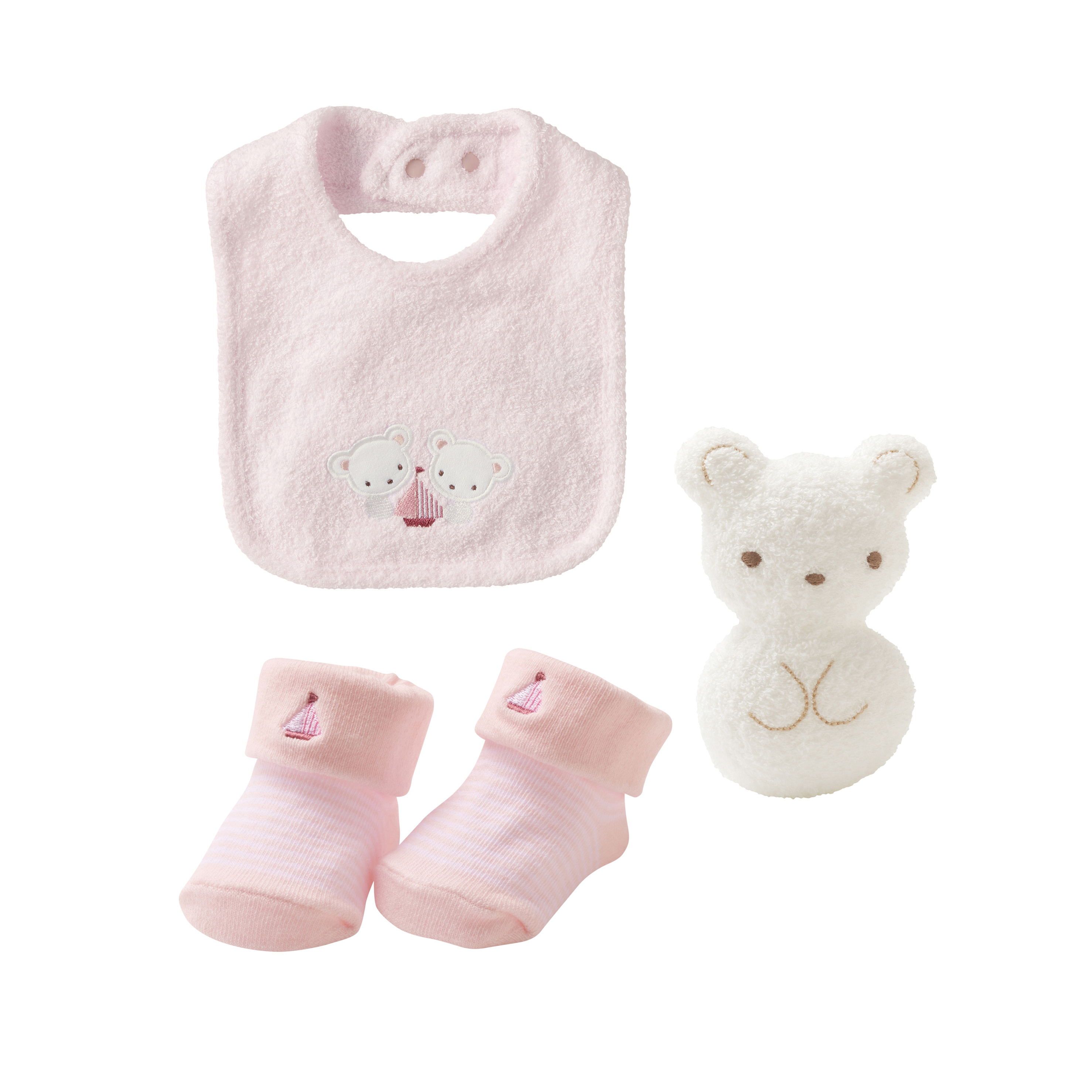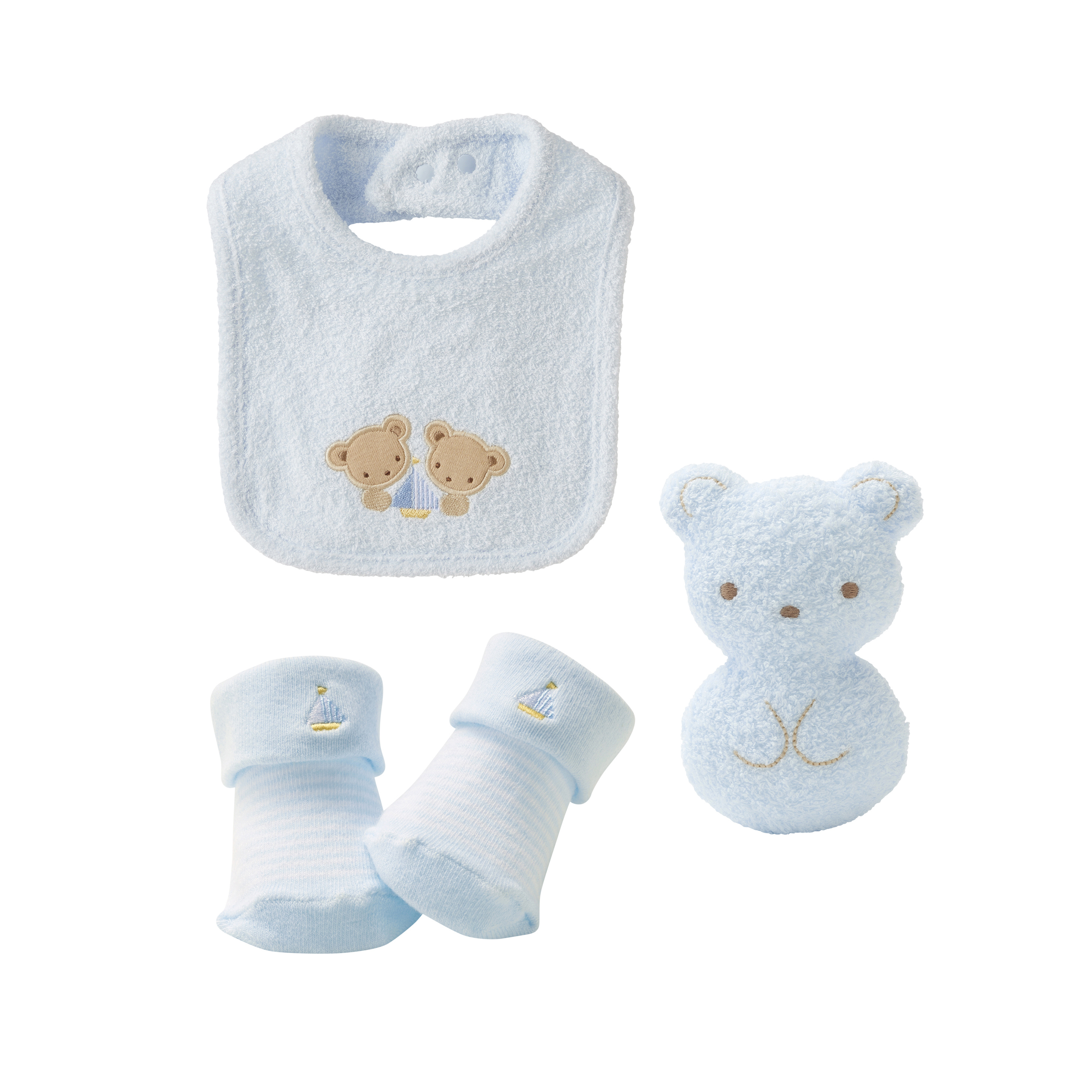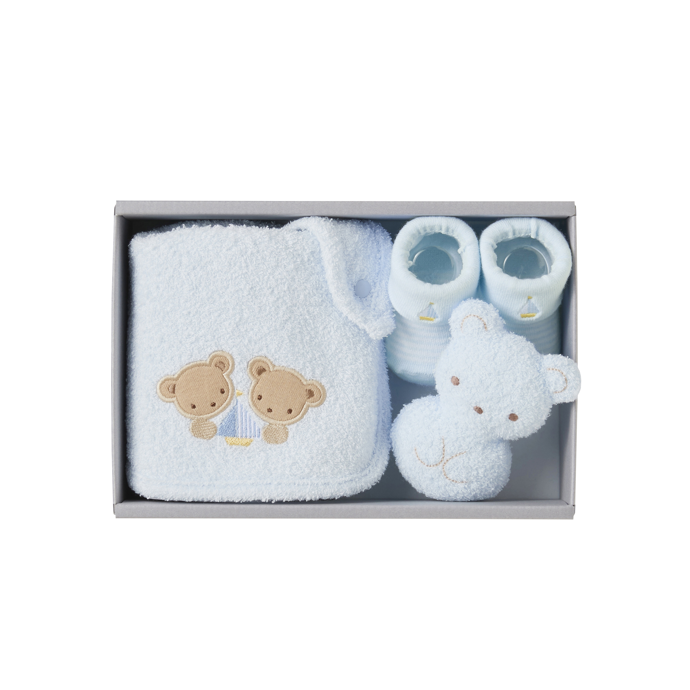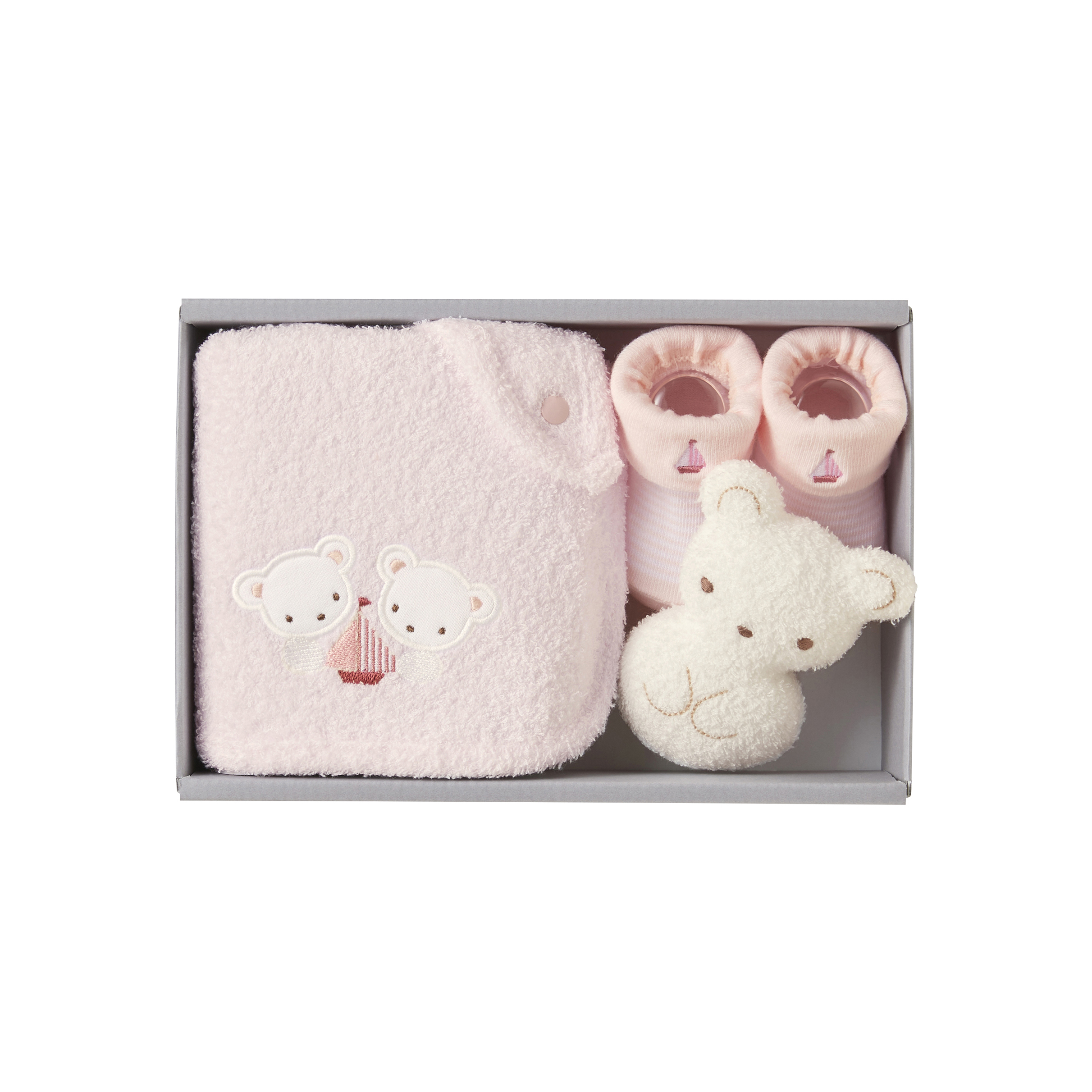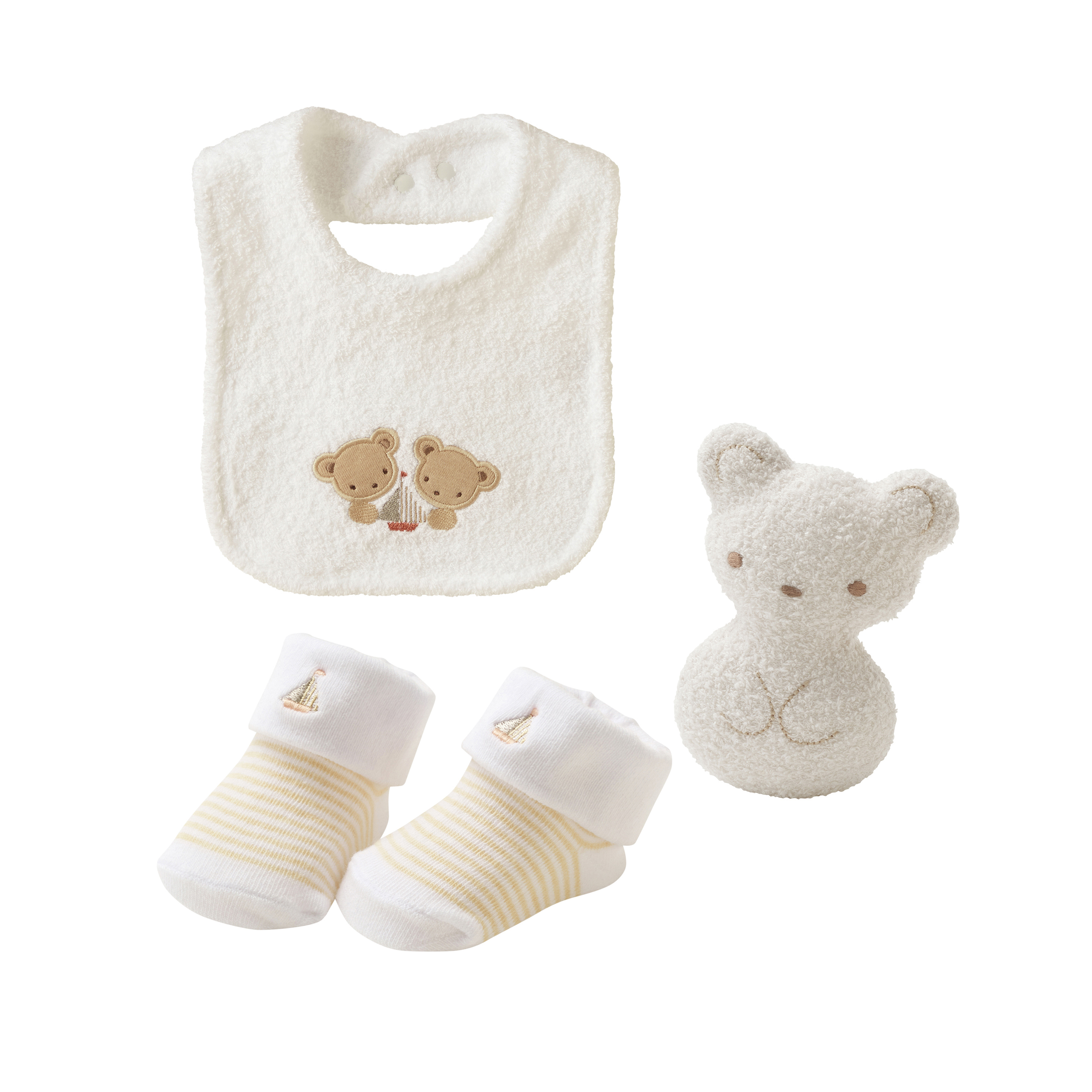 スリーピーパイルのスタイとマスコット、カップソックスの3点ギフトセットです。スタイとカップソックスは、ヨットのアートがリンクしているギフトセット限定デザイン。くまのマスコットはおなか部分を押すと音がなる仕様になっています。