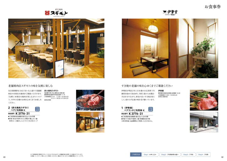 すき焼の老舗「伊勢重」など、お肉料理とともに素敵な時間をお楽しみいただけるお食事券も掲載。