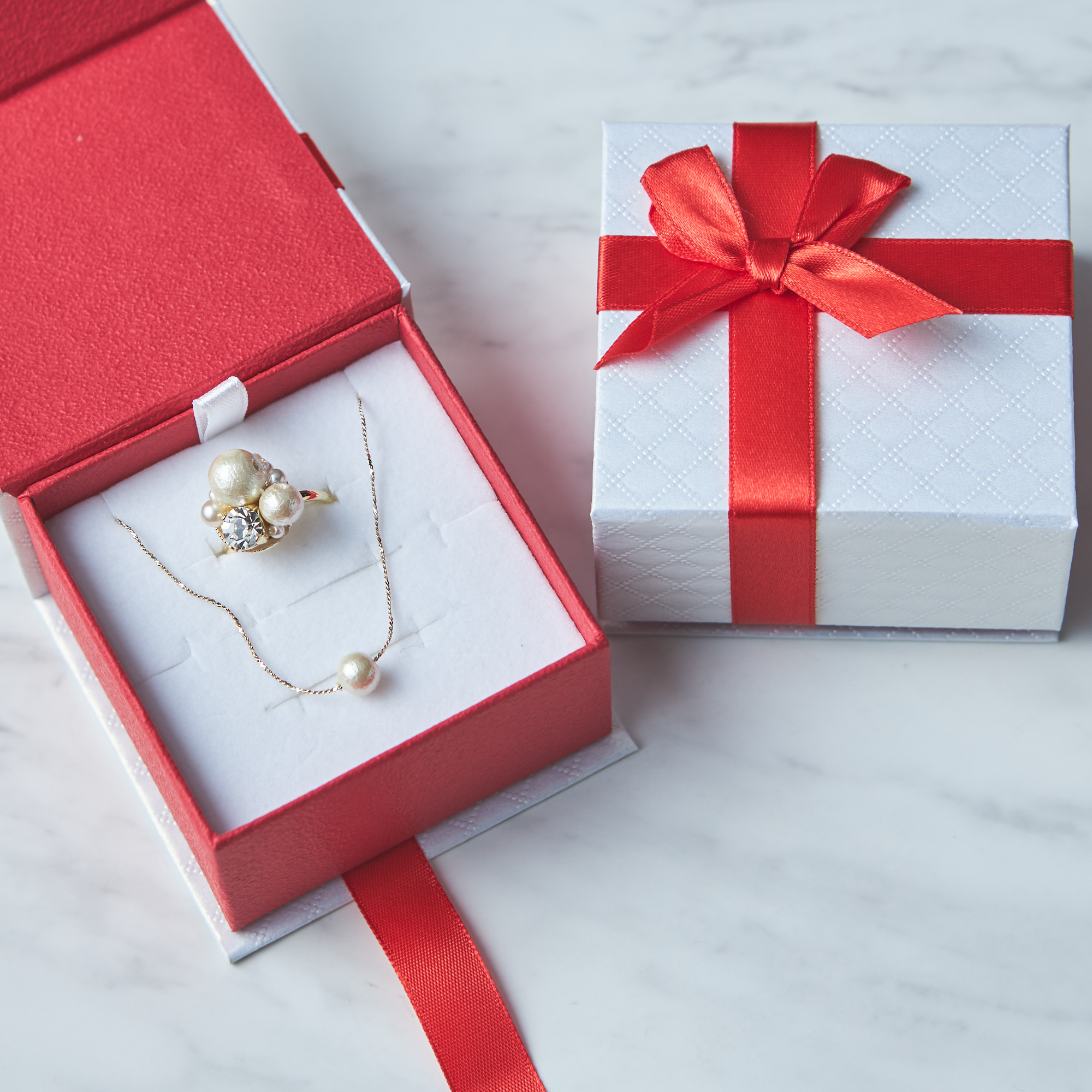 異なる雰囲気で得られる嬉しいギャップ!シンプルな一粒のコットンパールプチネックレスと、ゴージャスなコットンパール使いのデザインリングのセットです。開け閉めが簡単で、アクセサリーをずっと素敵に保管できるジュエリーボックス付きです。