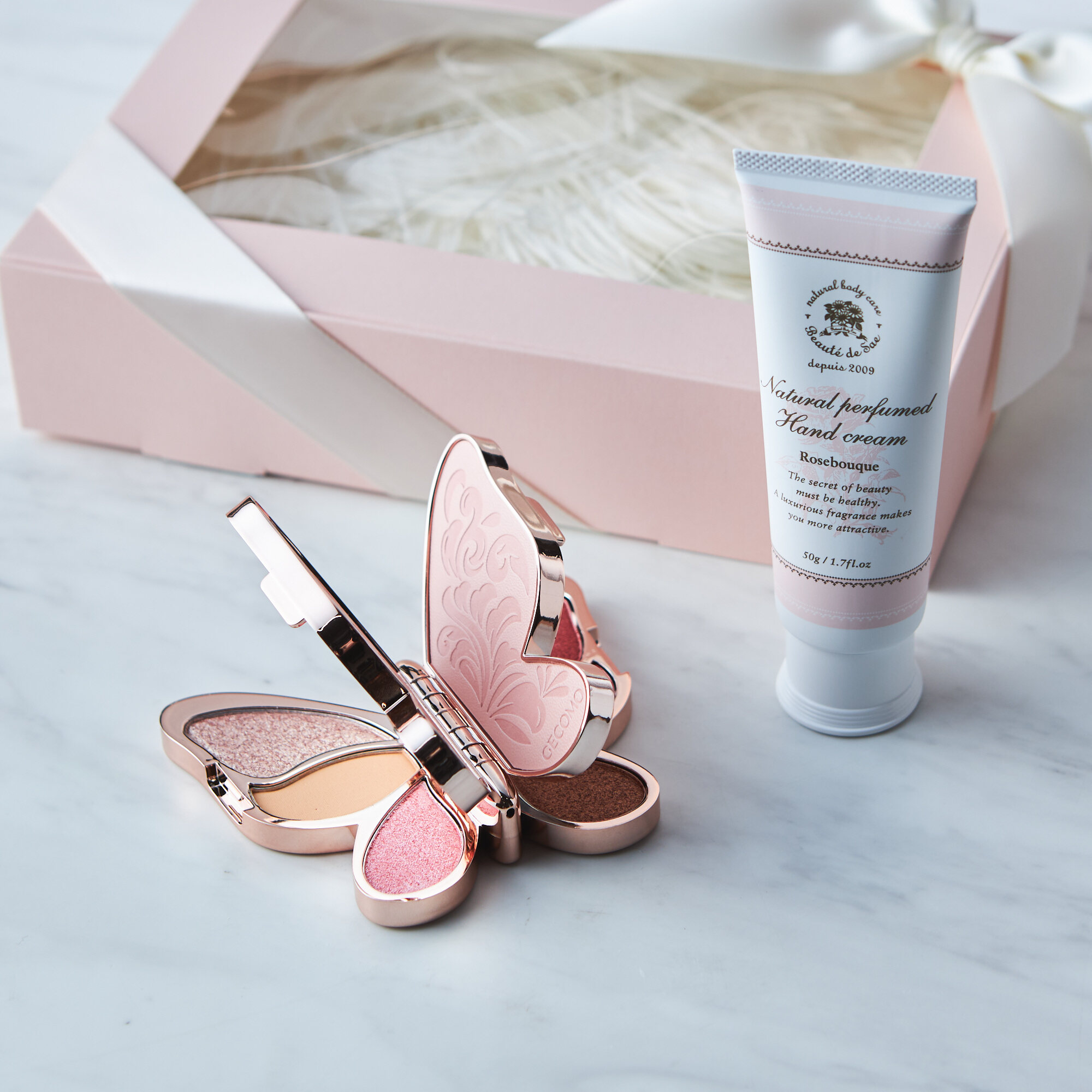 バタフライ型のパッケージがかわいいアイシャドウパレットと、レグランス ボディケアブランドのハンドクリームをセットでお届けします。パレットは複数のお色を組み合わせてリッチなメイクアップもお楽しみいただけます。ハンドクリームには良質な成分を配合、みずみずしい肌へ導いてくれます。
