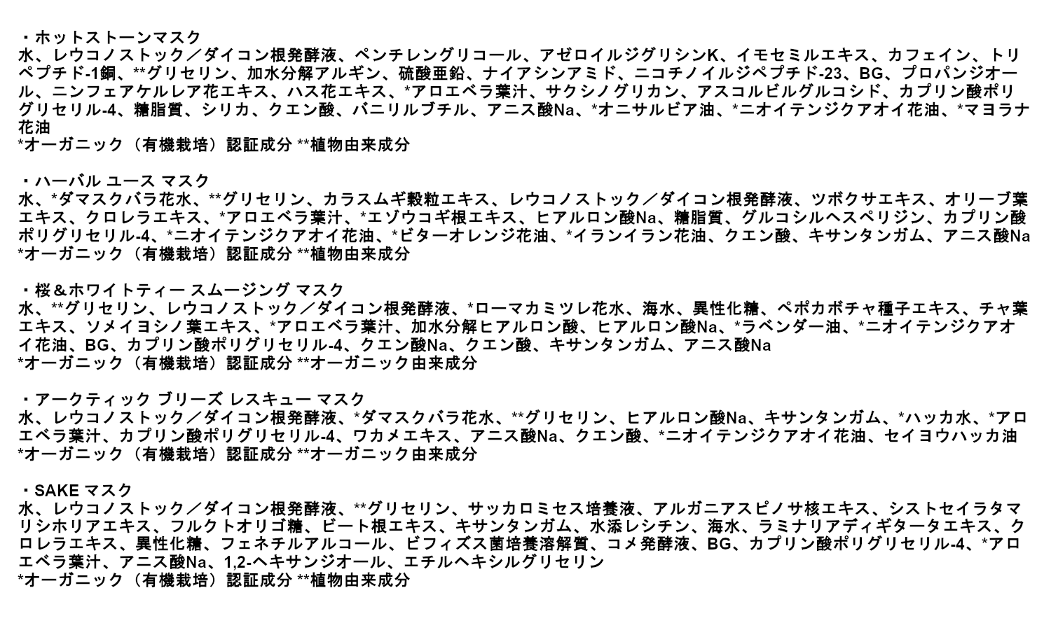 | 内容量/内容物 | 5枚(ホットストーンマスク、ハーバル ユース マスク、桜&ホワイトティー スムージング マスク、アークティック ブリーズ レスキュー マスク、SAKE マスク) |