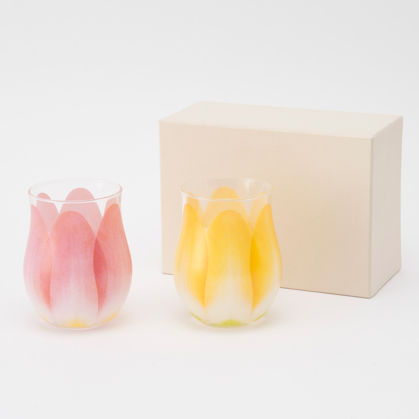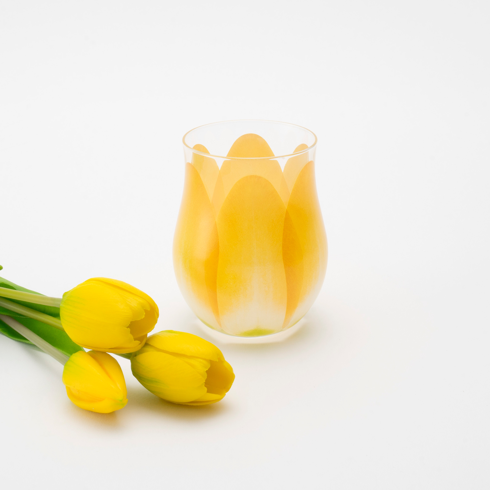 可愛く咲いたチューリップグラス。繊細な花脈や、鮮やかなグラデーション。幾度となく試作を繰り返し、本物のチューリップと見間違えるほど再現度にこだわりました。転写紙にプリントされた6枚の花びらを一つひとつ丁寧に貼り付け焼成する手間のかかったグラスです。