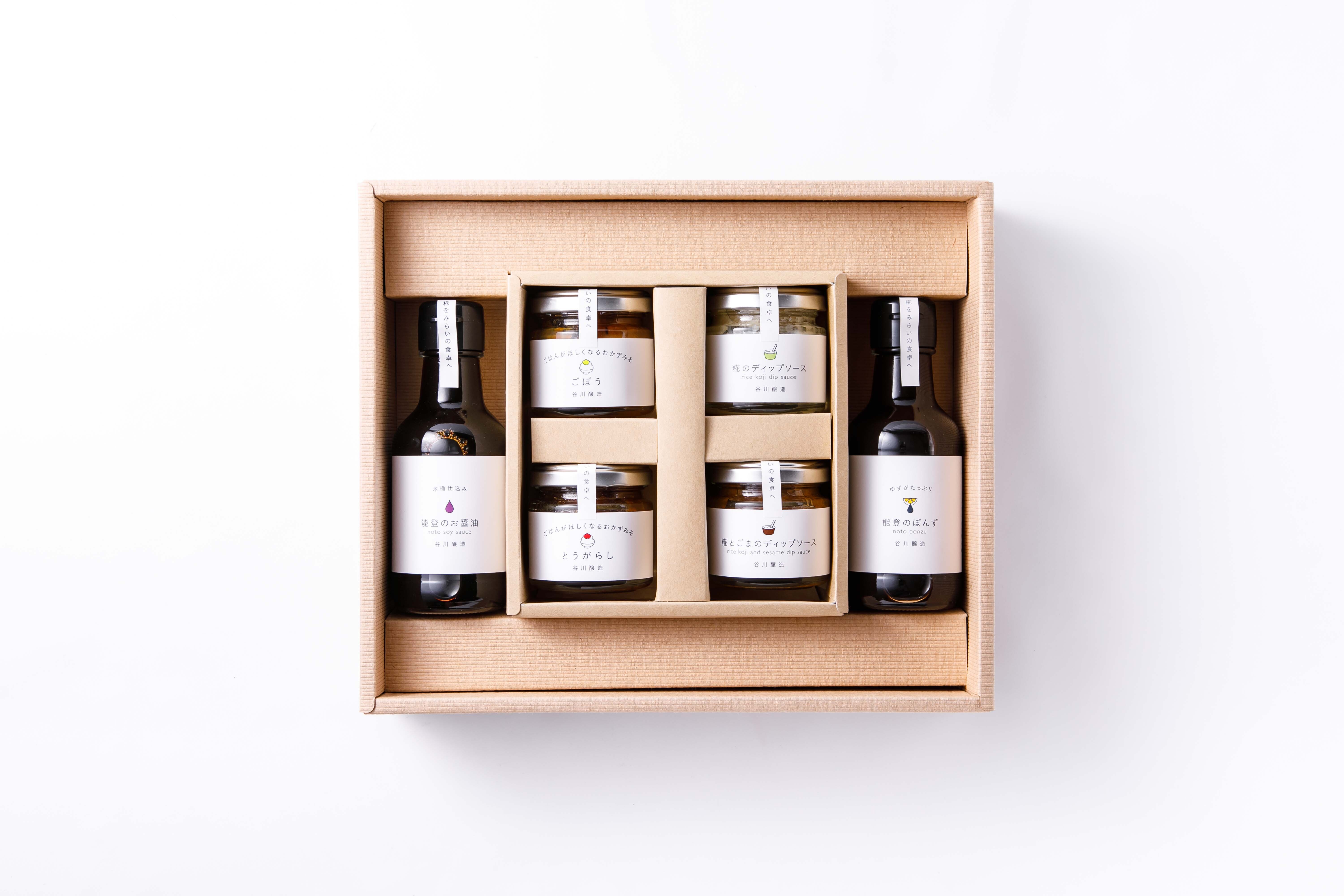 | 賞味期限 | 製造日から 能登のぽんず:10か月 能登のお醤油:1年 糀のディップソース、糀とごまのディップソース:10か月 おかずみそ:7か月 |