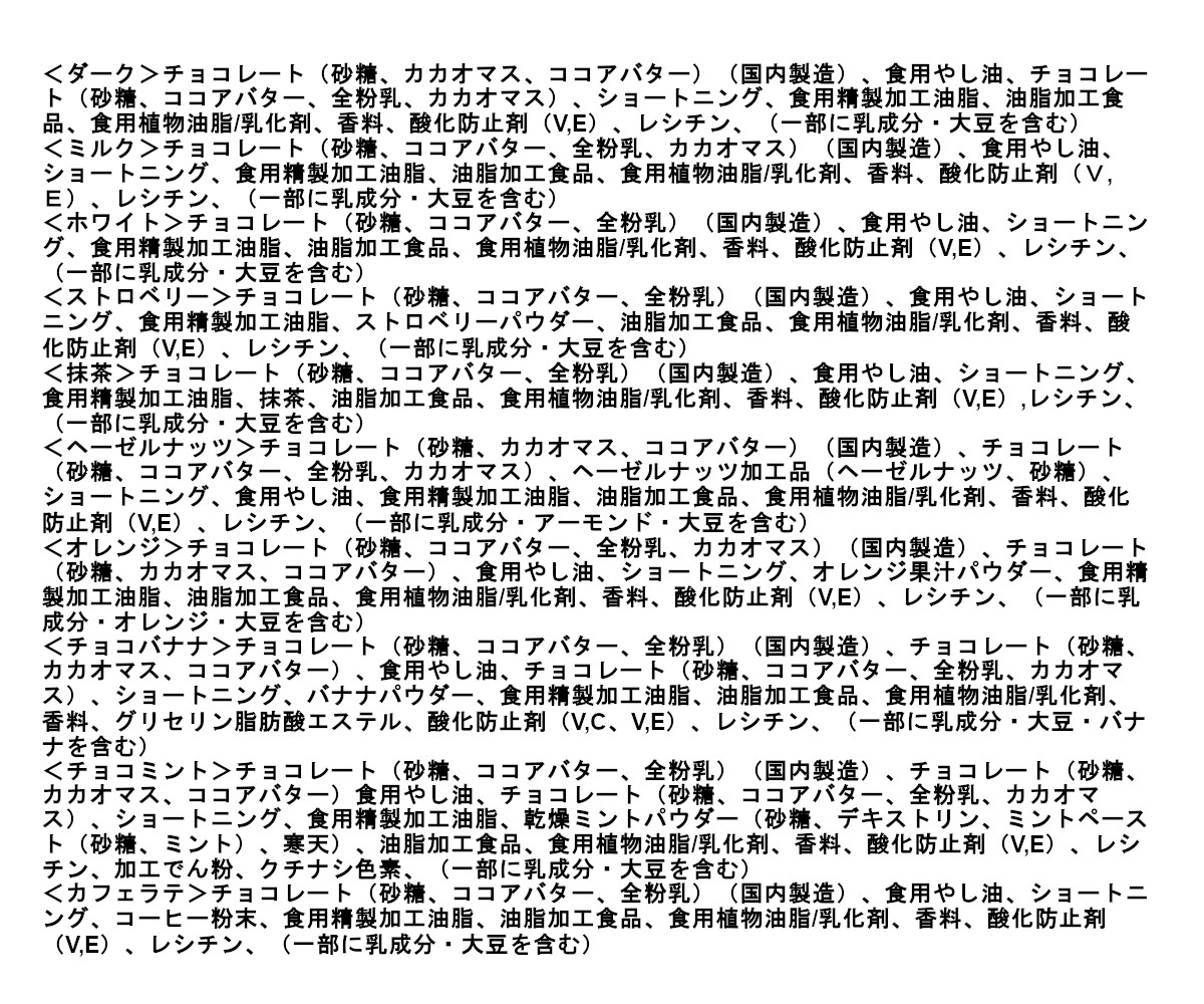 たっぷり10フレーバー×2個。 ダーク、ミルク、ホワイト、ストロベリー、抹茶、ヘーゼルナッツ、オレンジ、チョコバナナ、チョコミント、カフェラテが入っています。