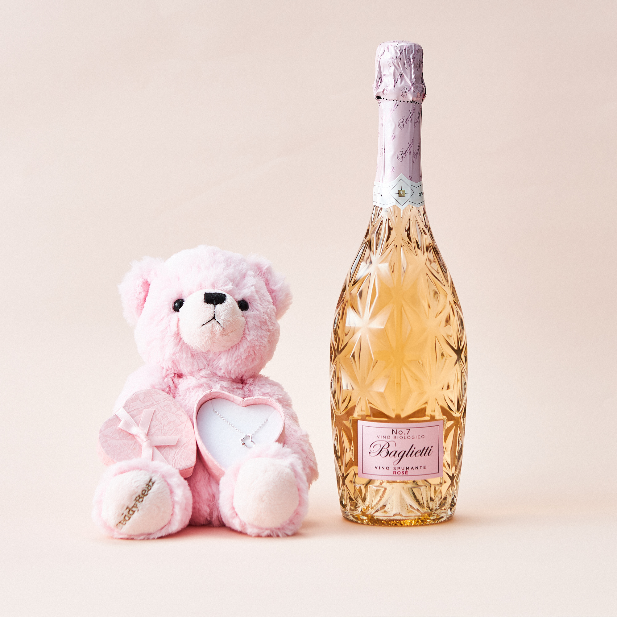 2種類からお選びいただけるスパークリングワインとふわふわで可愛いテディベアのぬいぐるみと、誕生石をあしらったオープンハートモチーフのネックレスがセットになった特別なギフトセットです。プレゼントした瞬間に歓声が上がりそうな、専用のギフトバッグに入れてお届けいたします。