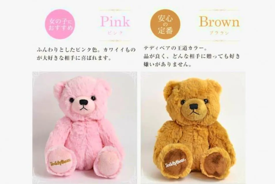 思わずギュッとしたくなる、ふわふわで可愛いテディベアはピンク、ブラウン、ホワイトの3色からお選びいただけます。テディベアは大き過ぎずちょうどよいサイズ感。お出かけ先でもお渡しやすいです。