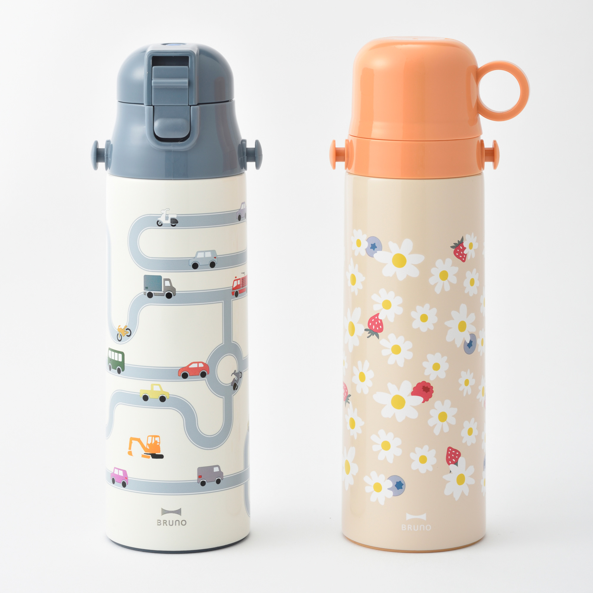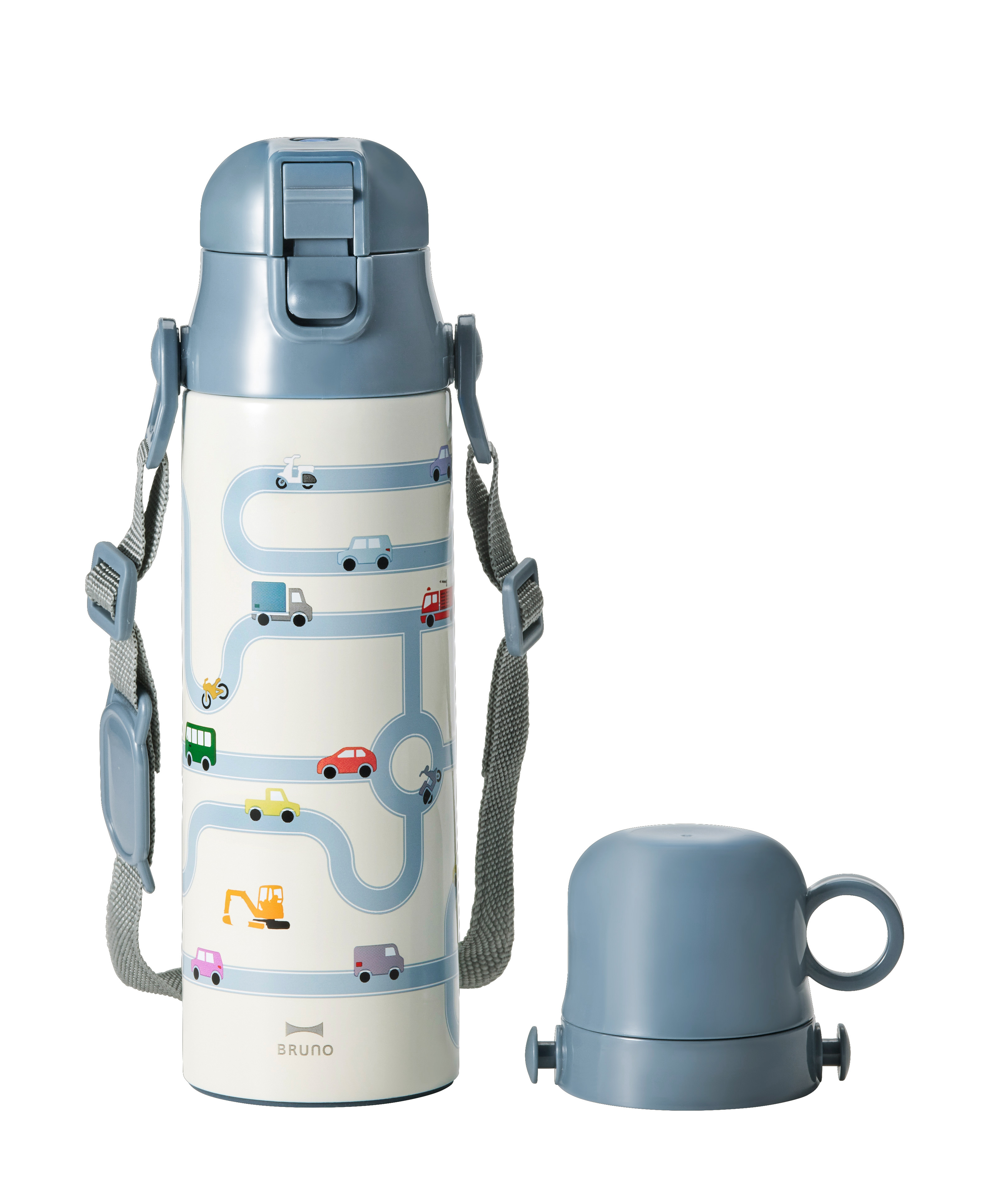 注いで飲めるコップタイプと、直接口をつけて飲める直飲みタイプの2wayボトル。使用シーンやお子さまの成長に合わせてお使いいただけます。真空二重構造なので保温・保冷もOKで、たっぷり容量の580ml。軽量&スリムなデザイン、ショルダーストラップ付きなので、自分で持ちたいお子さまでも安心して持ち運びやすい形状です。