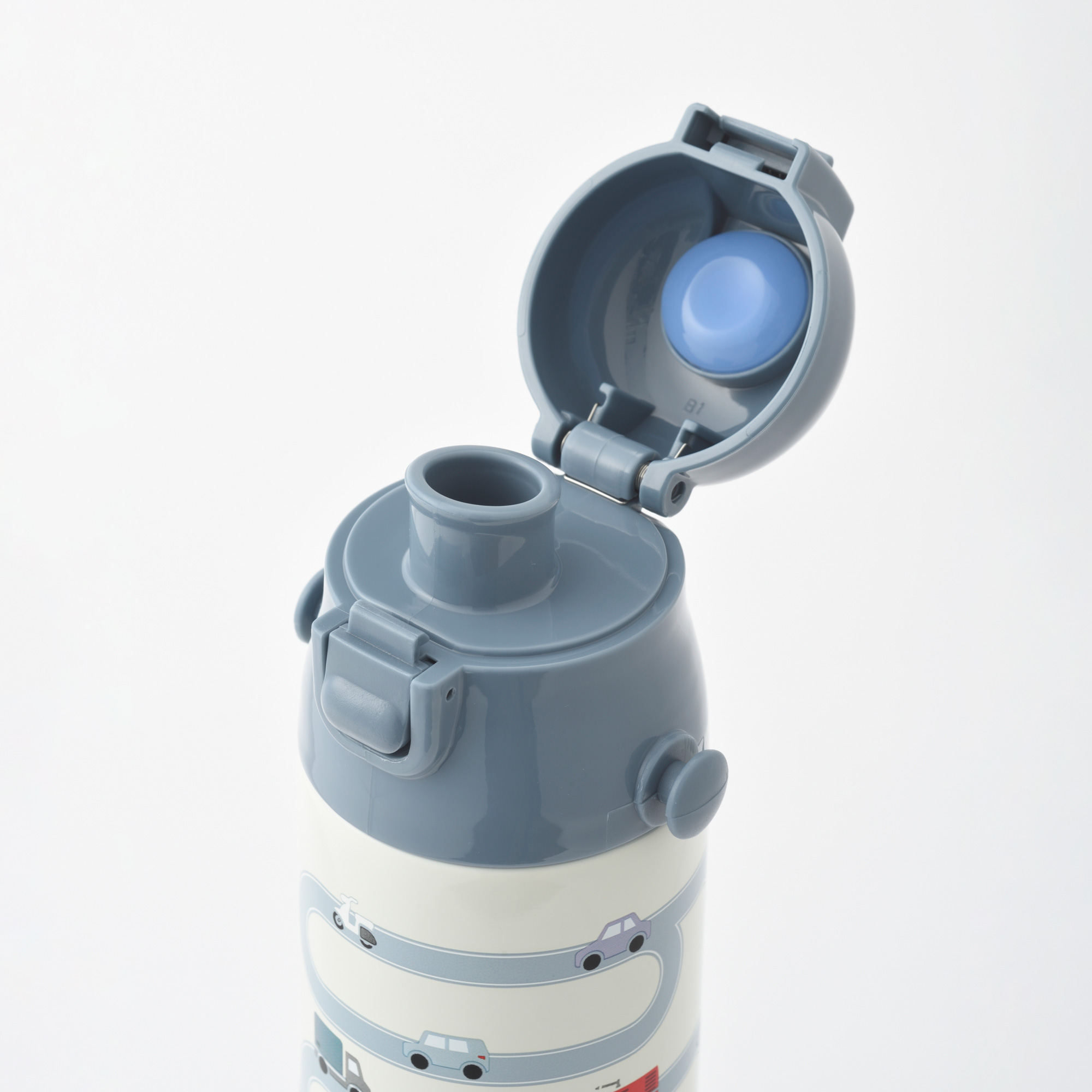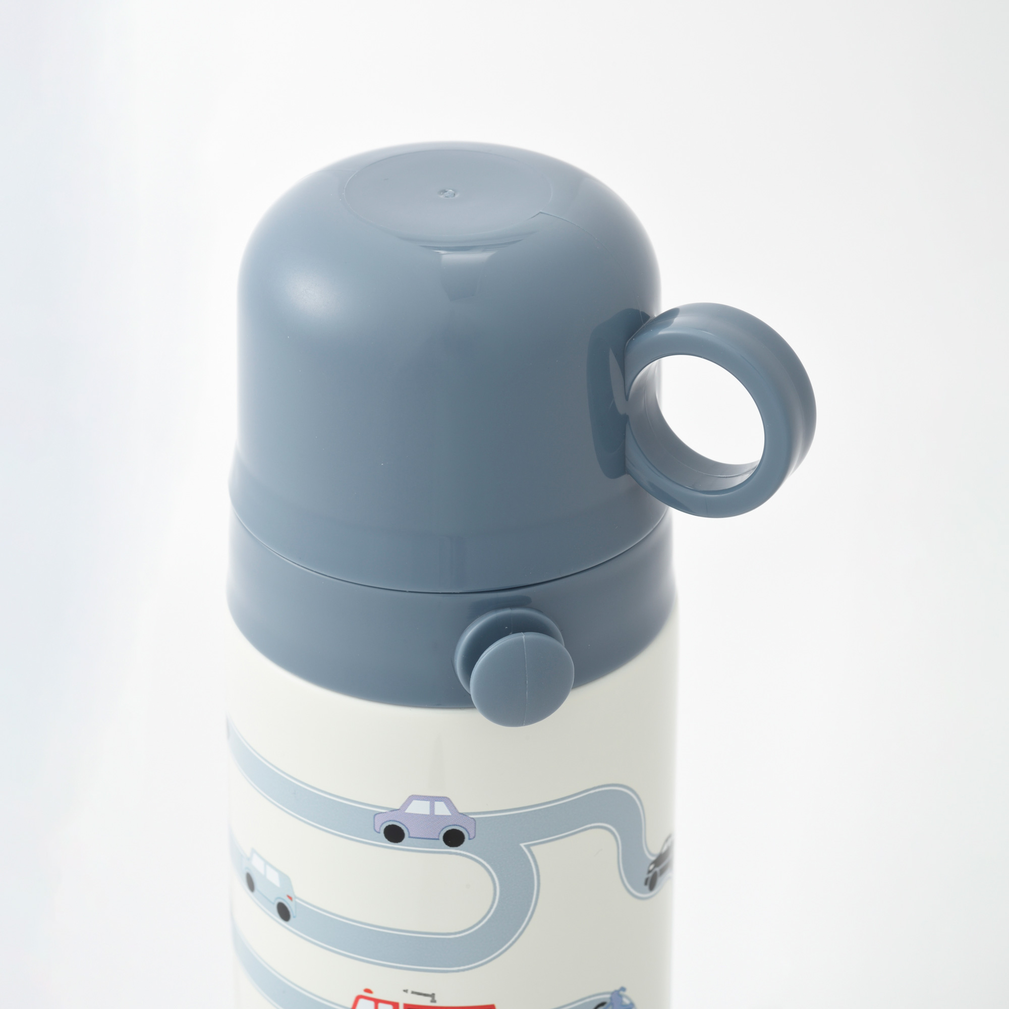 ・小さな手でも持ちやすい、リング状の持ち手がついたカップ。 ・中せんはプッシュして開閉するタイプです。 ・真ん中の赤いボタンでオープン、外側のグレーのボタンでクローズします。