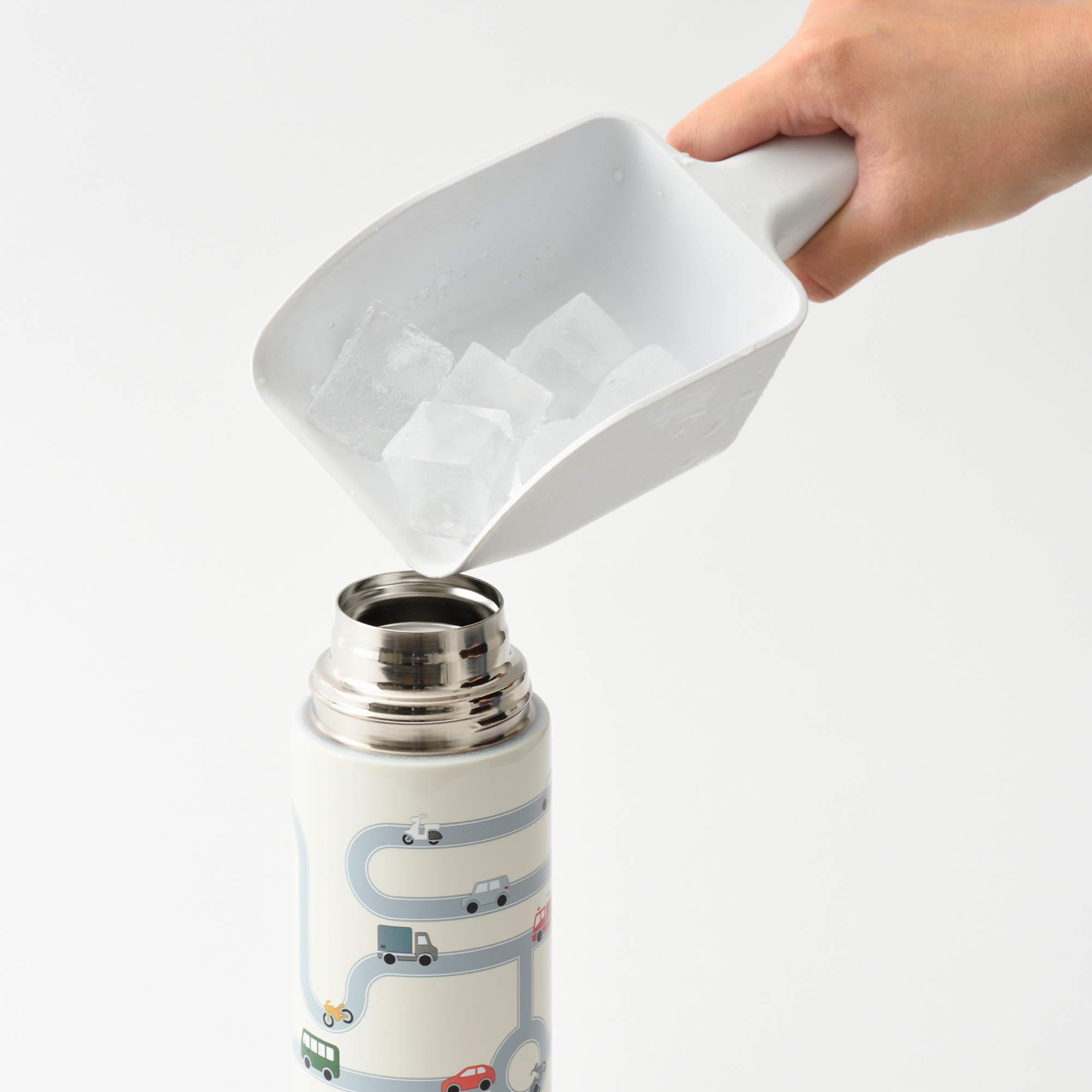 ・内側は保温・保冷効果の高いステンレス製の真空二重構造です。 ・広口タイプで大きめの氷も入ります。 ・中せんやパッキンは分解して丸洗いができるので、衛生的にお使いいただけます。 ・ストラップにはネームシールが貼れるタグが付いています。 ・底面には、テーブルに置いたときに音がしにくく倒れにくいエラストマー素材を使用しました。