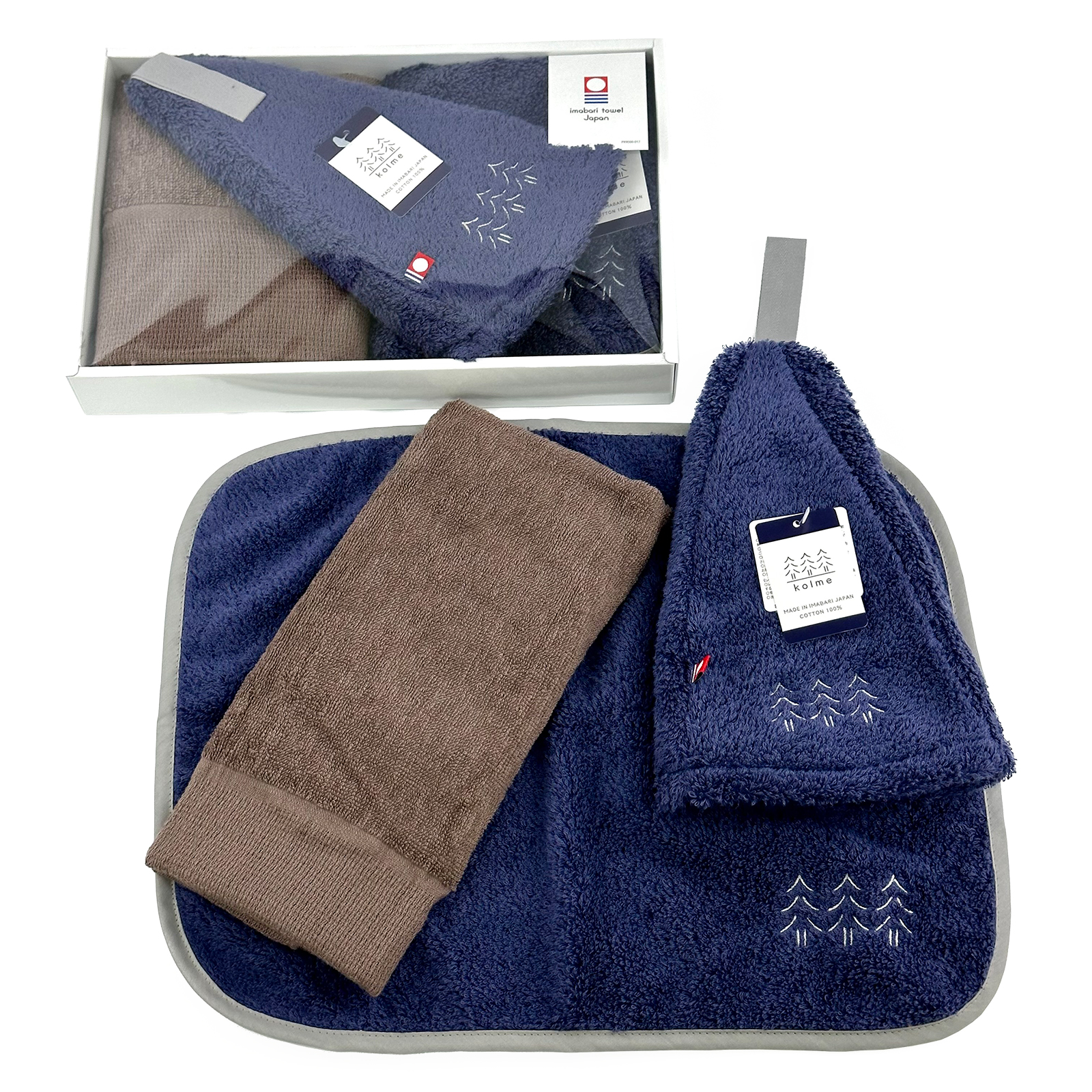 細く上質な綿糸で織り上げたタオル生地から、ひとつひとつ丁寧に作ったサウナハットとサウナマット、さらにコンパクトで軽く使いやすいサウナタオルの3点セットです。柔らかく軽い風合いとシックなカラーは、サウナ空間にもよく馴染みます。厳しい吸水性基準をクリアした今治タオルブランド認証付きです。