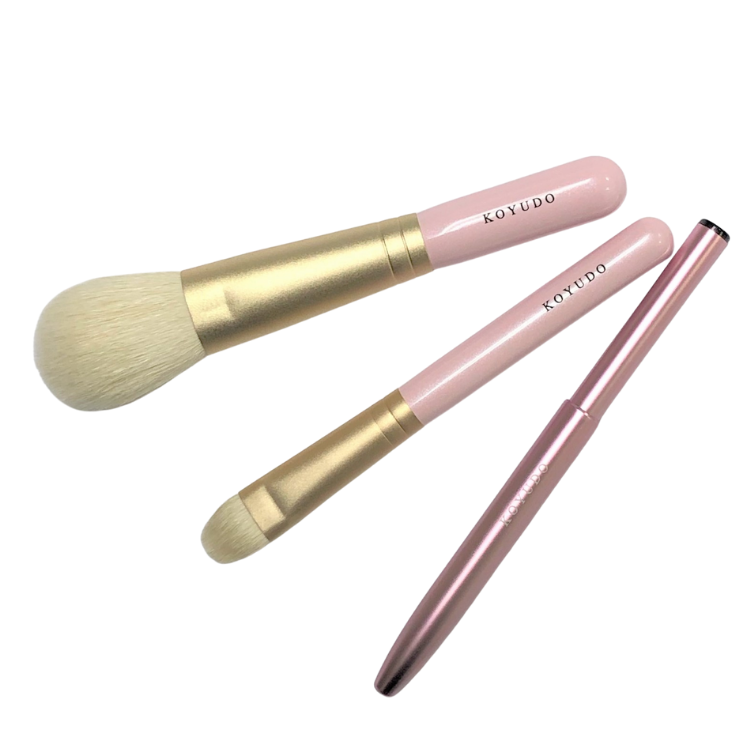 上質な熊野筆にかわいらしさと高級感を兼ね備えたメイクブラシ3本セットです。これさえあればメイクタイムも快適に過ごせます。