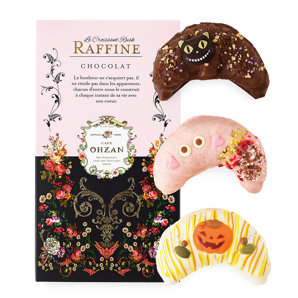 「CAFE OHZAN(カフェ オウザン)」がお届けするハロウィン限定デザイン!ハロウィンモチーフが目立つクロワッサンラスクは、シリーズの中でもとびきりのインパクト!この時期定番のハロウィン=オレンジとは違う、華やかな大人可愛いハロウィン、この日のための特別なお菓子を、贈り物にいかがでしょうか。