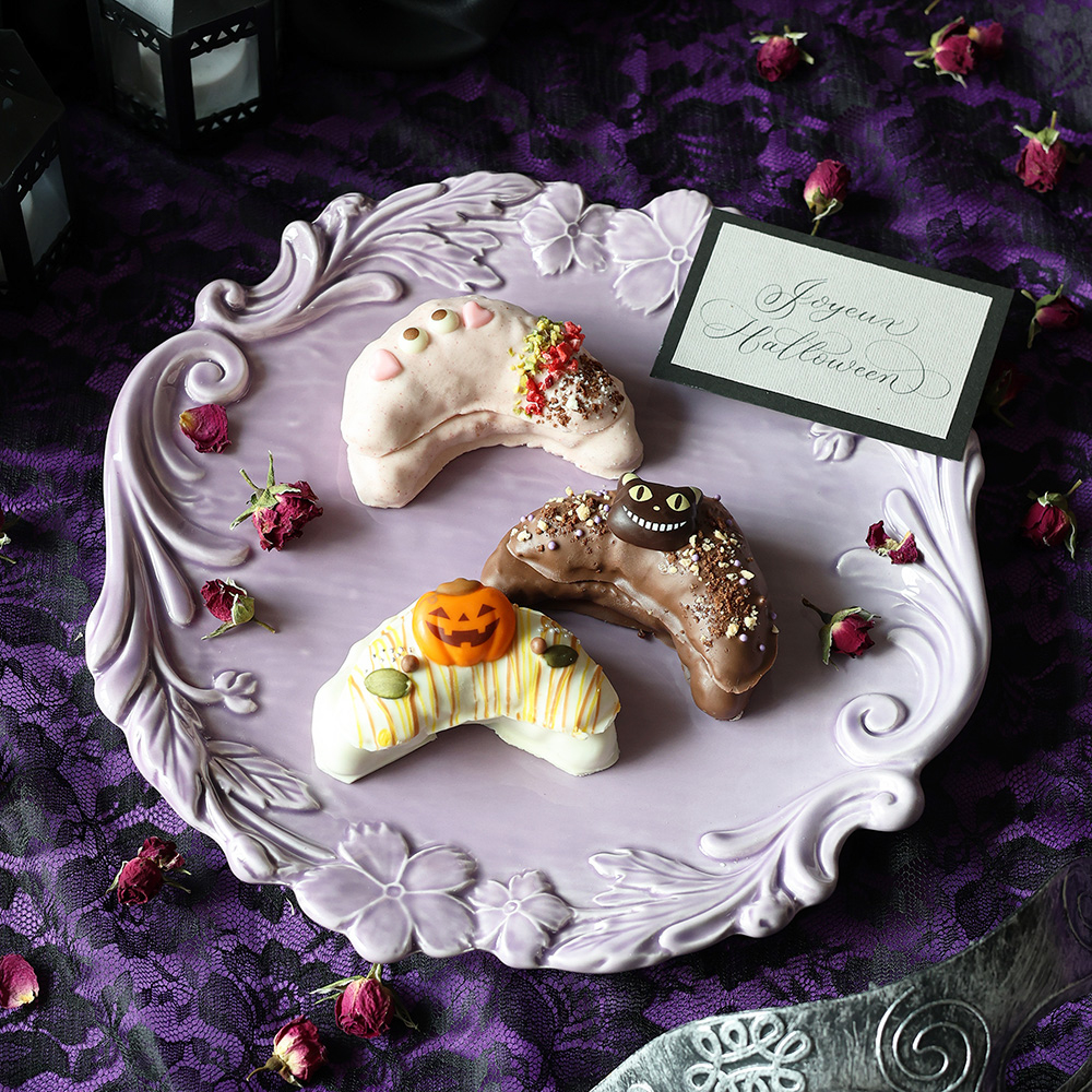 三日月形のクロワッサンをサクサクに焼き上げた、ボリューム感のあるラスク。 ハロウィンモチーフが目立つクロワッサンラスクは、シリーズの中でもとびきりのインパクト! ミルクチョコレートに化け猫のプレートがあしらわれた「シャノワール」、目玉モチーフが可愛い「モミー」、かぼちゃモチーフの「ジャックオランタン」と、それぞれ名前がついています。 箱から出して、1つずつ配るお菓子としてもおすすめです。