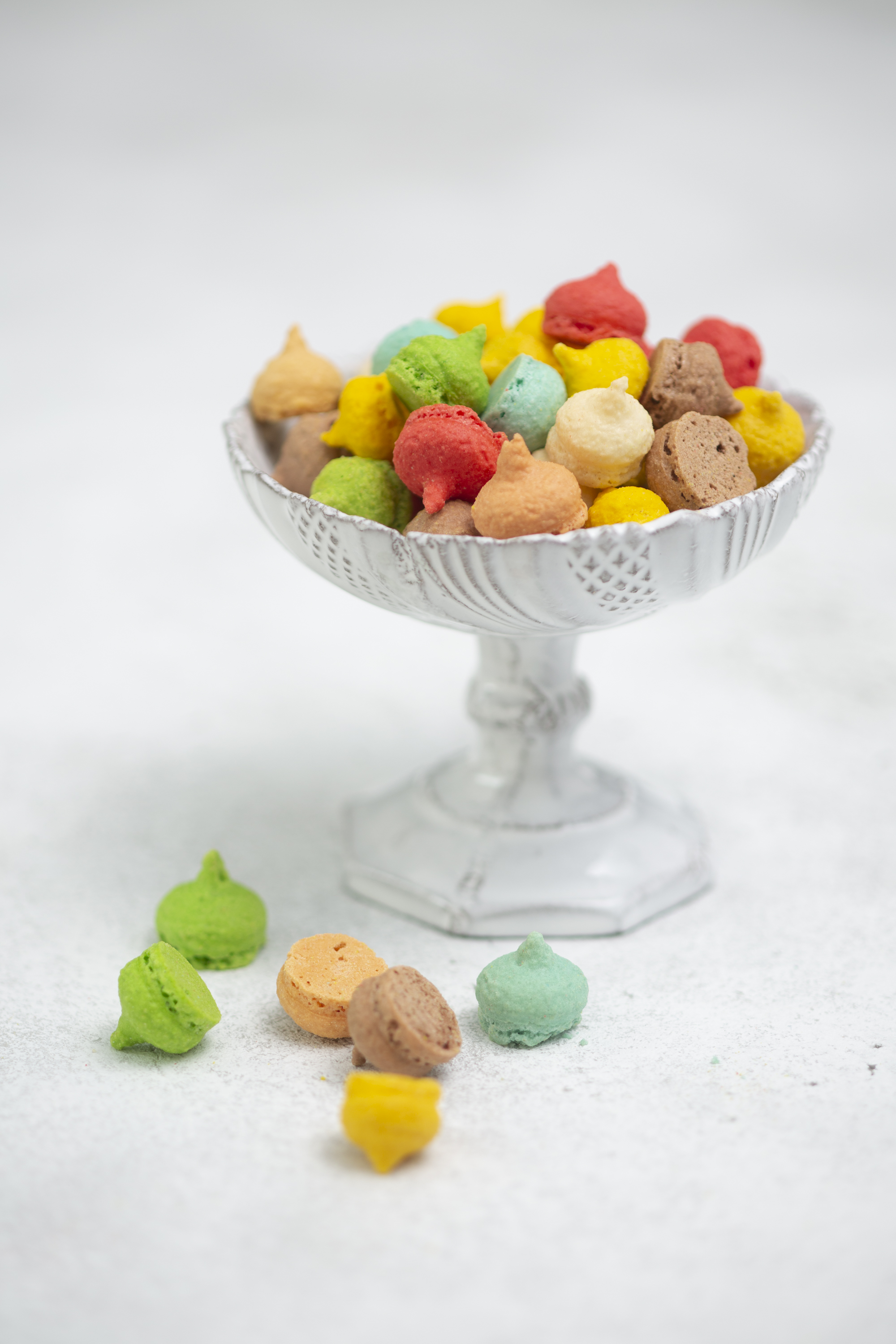 大口注文・法人のお問い合わせはこちら看板商品のマカロンボーロ。 マカロン生地に味付けをし、ミニサイズに小さく絞り出しサクッと軽い食感に焼き上げています。 色彩鮮やかな7色のマカロンボーロは開けた瞬間「かわいい!」と言ってしまうスイーツです。 フレーバーは7種類。 ショコラ、シトロン、ピスターシュ、カラメル、バニラ、イチゴ、アーモンドが入っています。