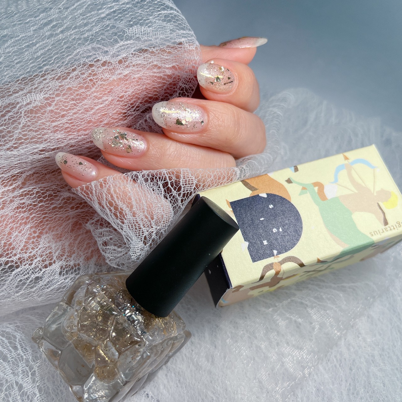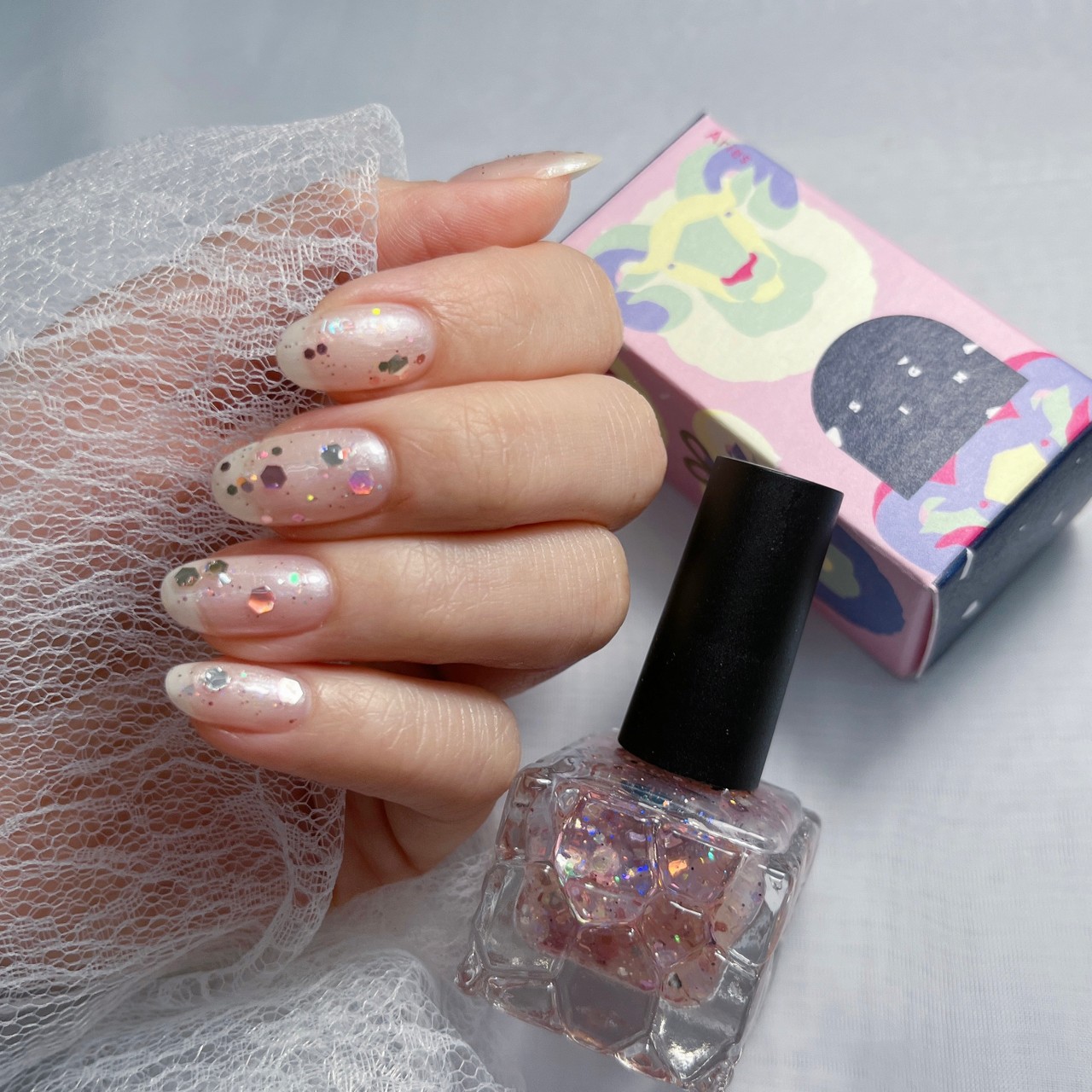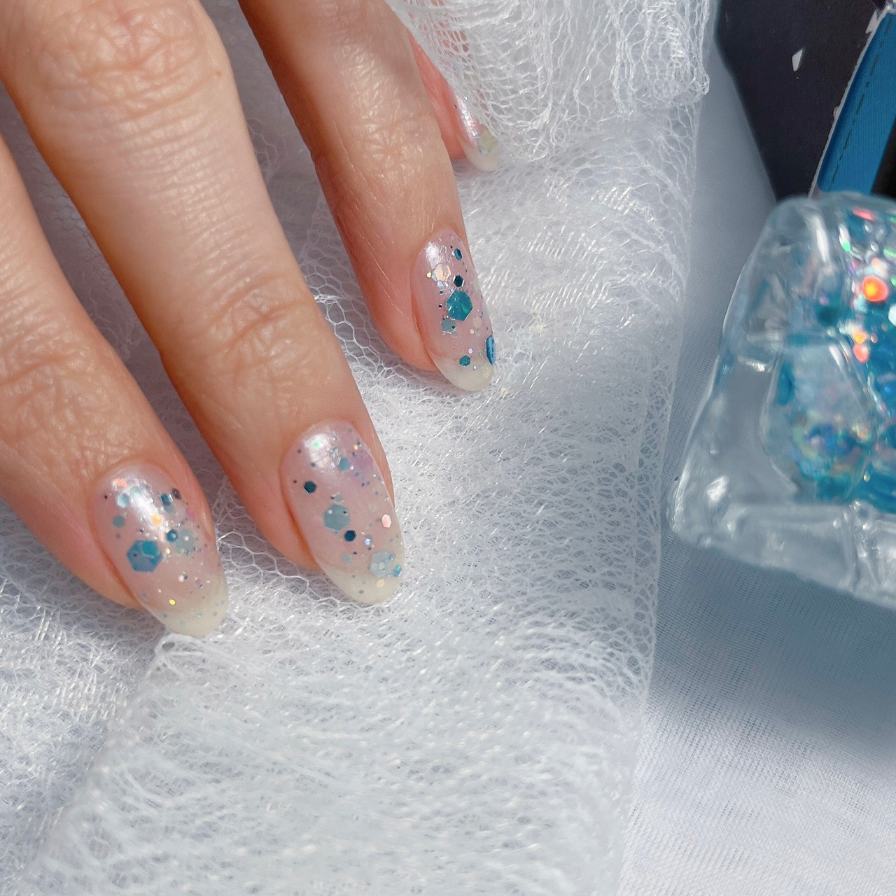 清潔な爪にラメネイルを塗布しよく乾かします。お好みでジェルクリアを重ね塗りしてください。仕上がりがちゅるんとします。