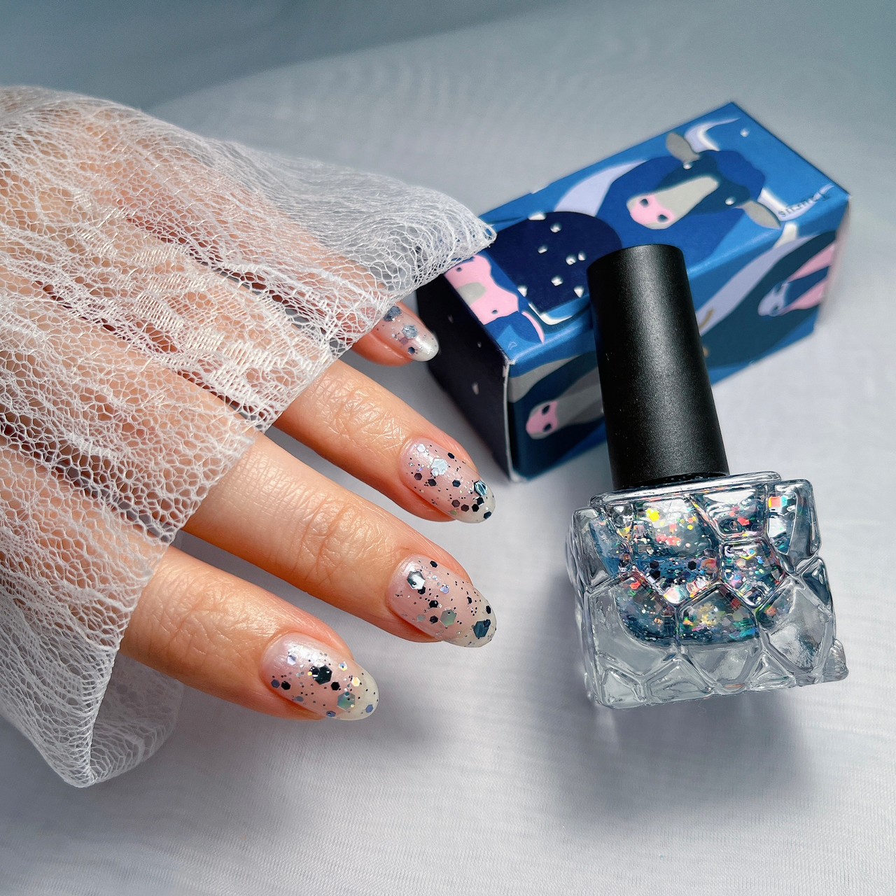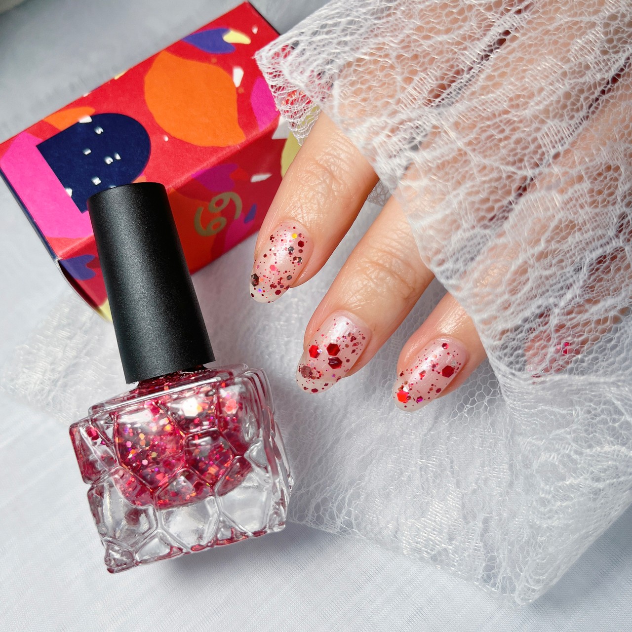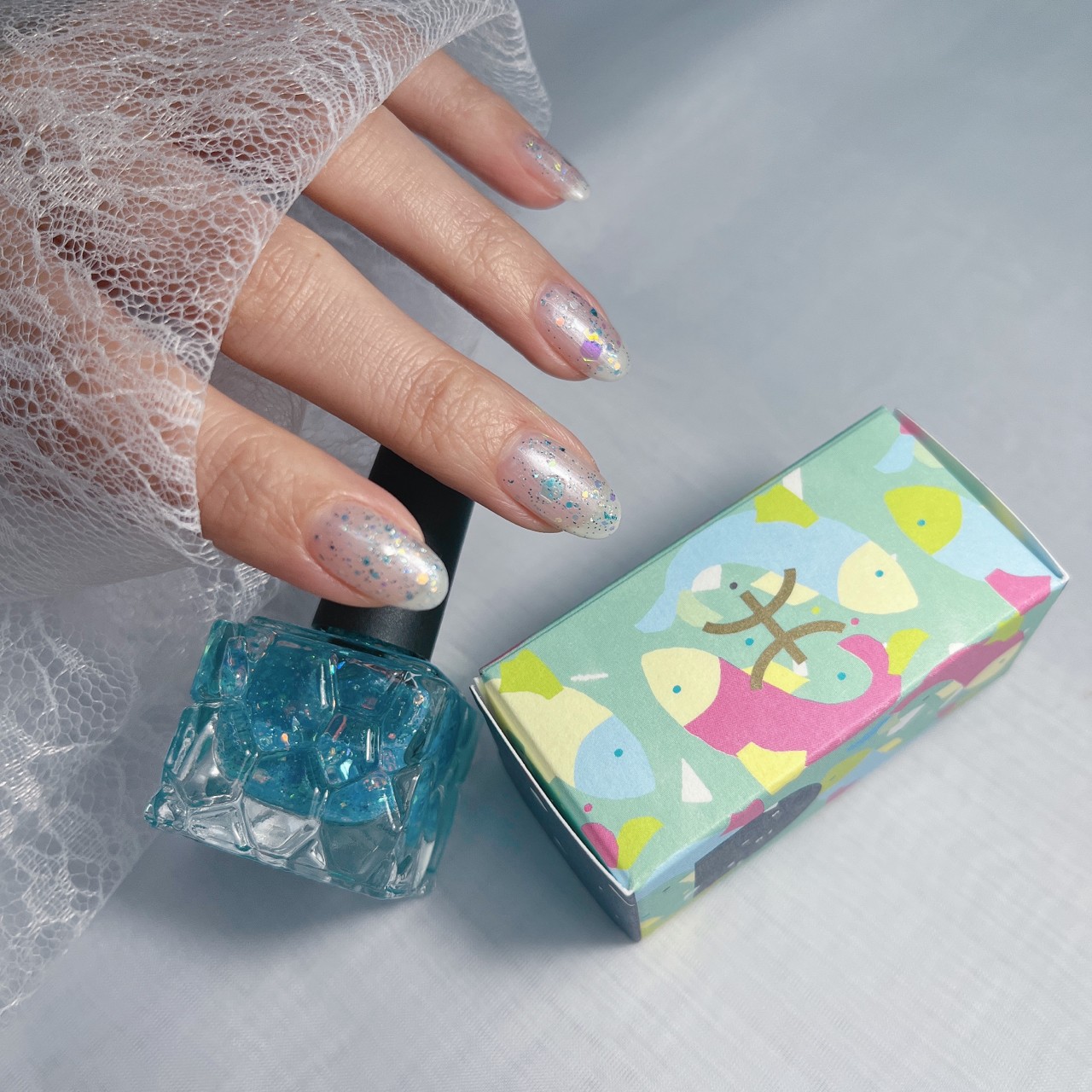 清潔な爪にラメネイルを塗布しよく乾かします。お好みでジェルクリアを重ね塗りしてください。仕上がりがちゅるんとします。