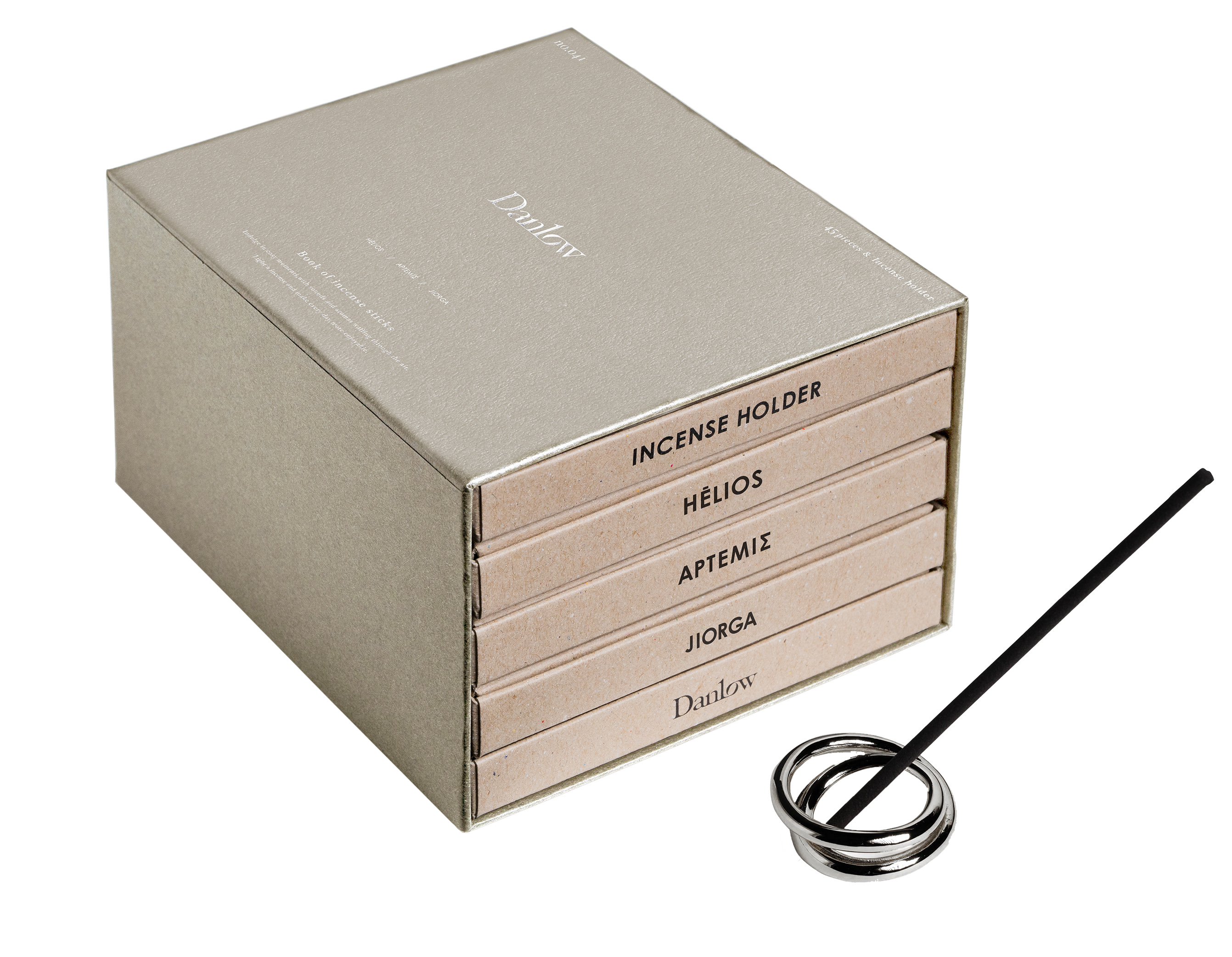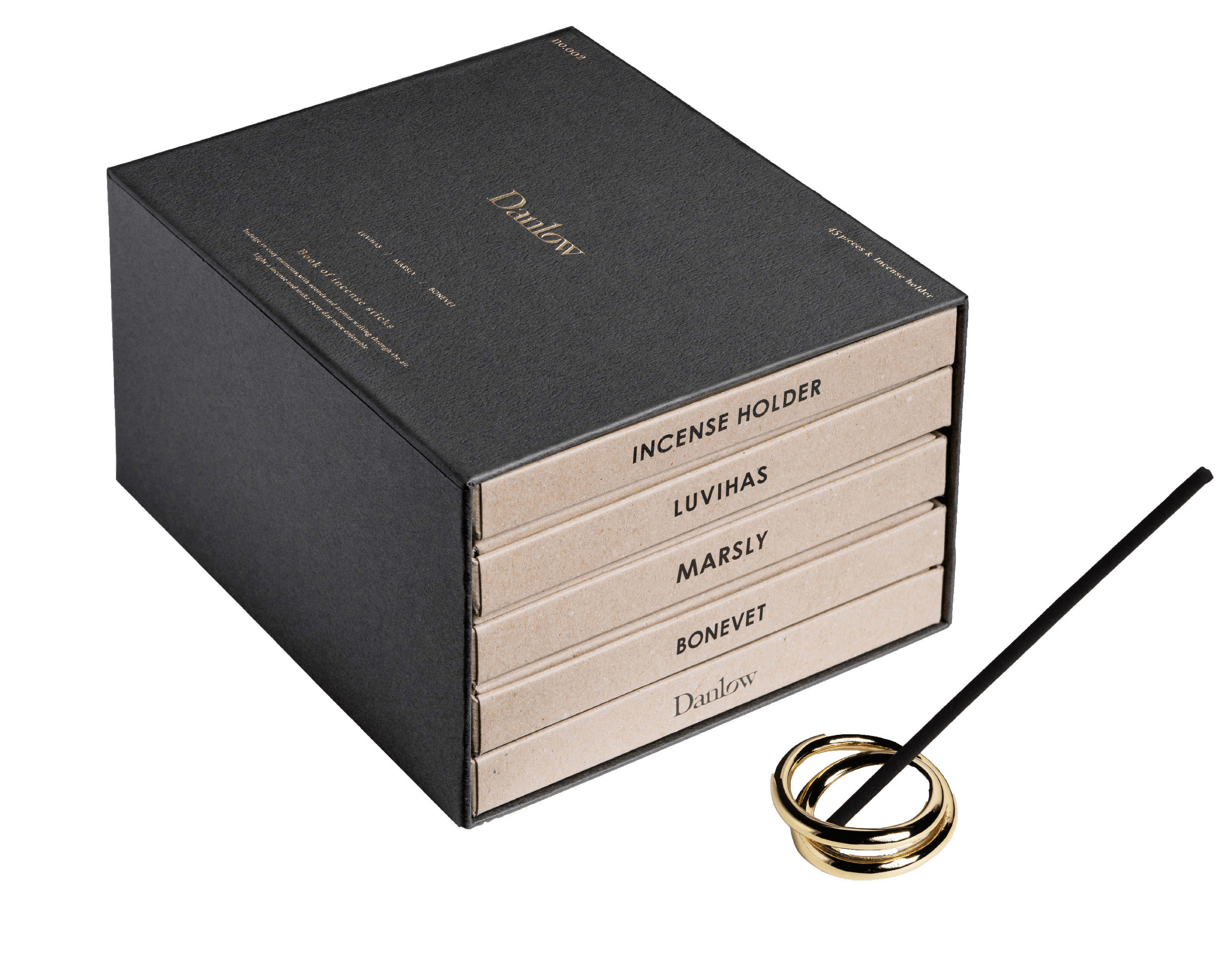 繊細に美しい煙と共に香り広がるDanlowのインセンススティック。心を静かに整え、研ぎ澄まされた空間へと誘うように、独自のフレグランスをブレンドした薫香がゆっくりと漂います。ブック型の引き出す1段1段に、香り別3種のインセンススティックと、インテリアの一部になるようなインセンスホルダーをセットしたスペシャルなキットです。