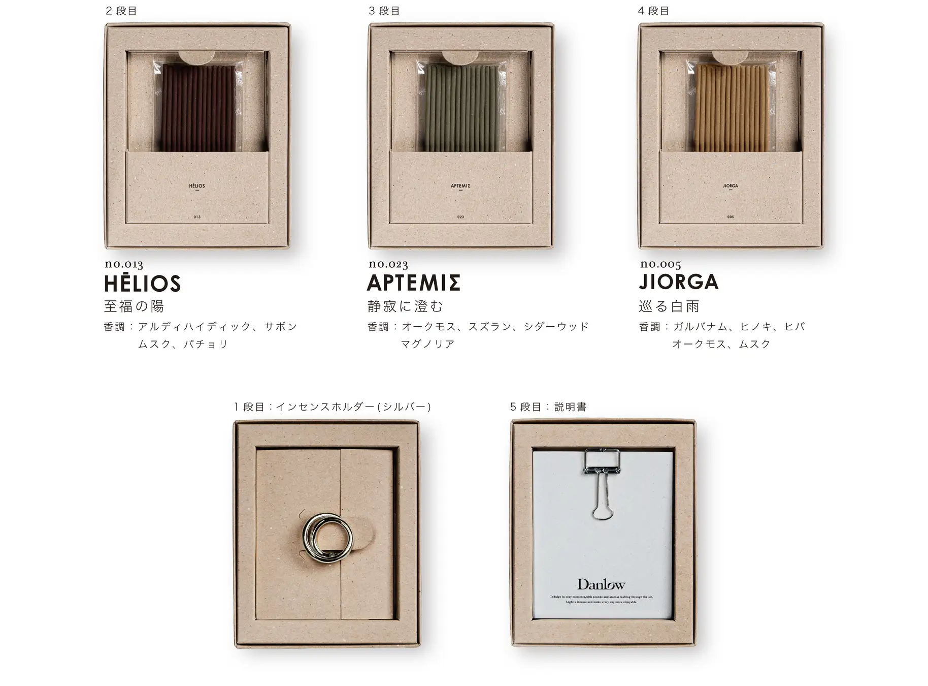 No.001のセットでは、ユニセックスに自然と都会を感じる香りを感じていただけます。 【内容説明】 1段目:インセンスホルダー 2段目:インセンススティック - THE DAN - 3段目:インセンススティック - GARTON - 4段目:インセンススティック - SHVERPOT - 5段目:説明書 【香り説明】 ■THE DAN(ザ ダン) " 神秘的な森 " 優しく儚い花と溶け合い共存する、深く神秘的な森を彷彿とさせるザダンは、フィグリーフ、アンバー、ウッドなどを複雑に絡ませながら高潔さを漂わせ、心を静かに落ち着かせてくれる魅惑的な香り。 ■GARTON(ガートン) " 解く紫煙 " 大胆にスモーキーでウッディな重厚感と、優雅な繊細さを密かに感じるガートン。サンダルウッド、カルダモン、サフラン、ホワイトリリーなどが混ざり合い、地下室の樽やウイスキー、シガーのある風情を想起させるフレグランス。 ■SHVERPOT(シュヴァーポット) "幻怪な自然 " ミステリアスな一面を持つ自然は美しい。そんな雄大な美学を感じるシュヴァーポットは、クローブ、シナモン、ローズ、アンバーが深く絡み合い、刺激的で時に優しく、時に人を惑わせる。